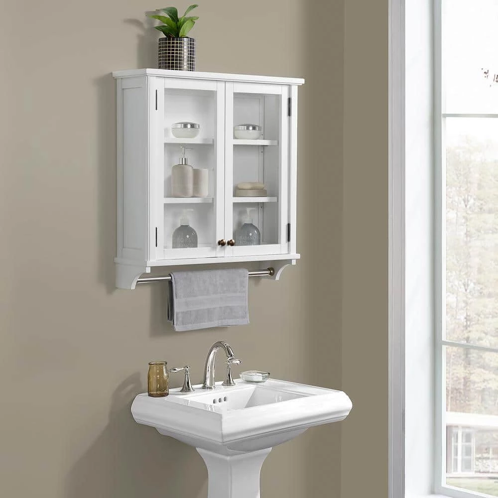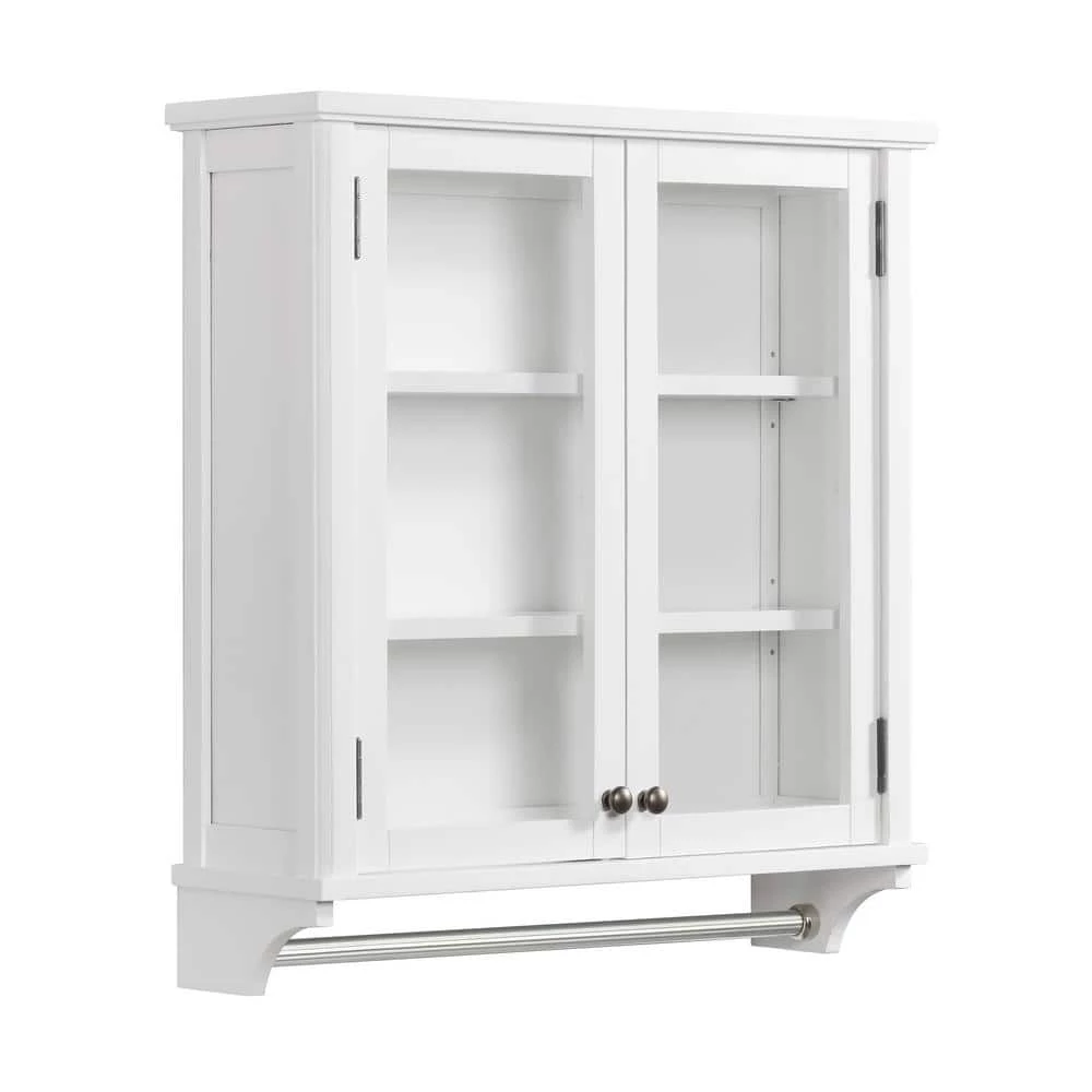 The Dorset Bathroom Furniture Collection provides both storage and modern style to your space. Wood construction with a white painted finish, these pieces are designed for both style and functionality. Store toiletries, stacked washcloths, rolled towels or anything you need to keep organized. Two glass doors and two adjustable shelves allow you to create your own stylized look.