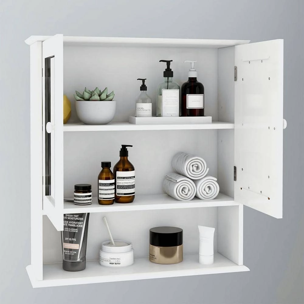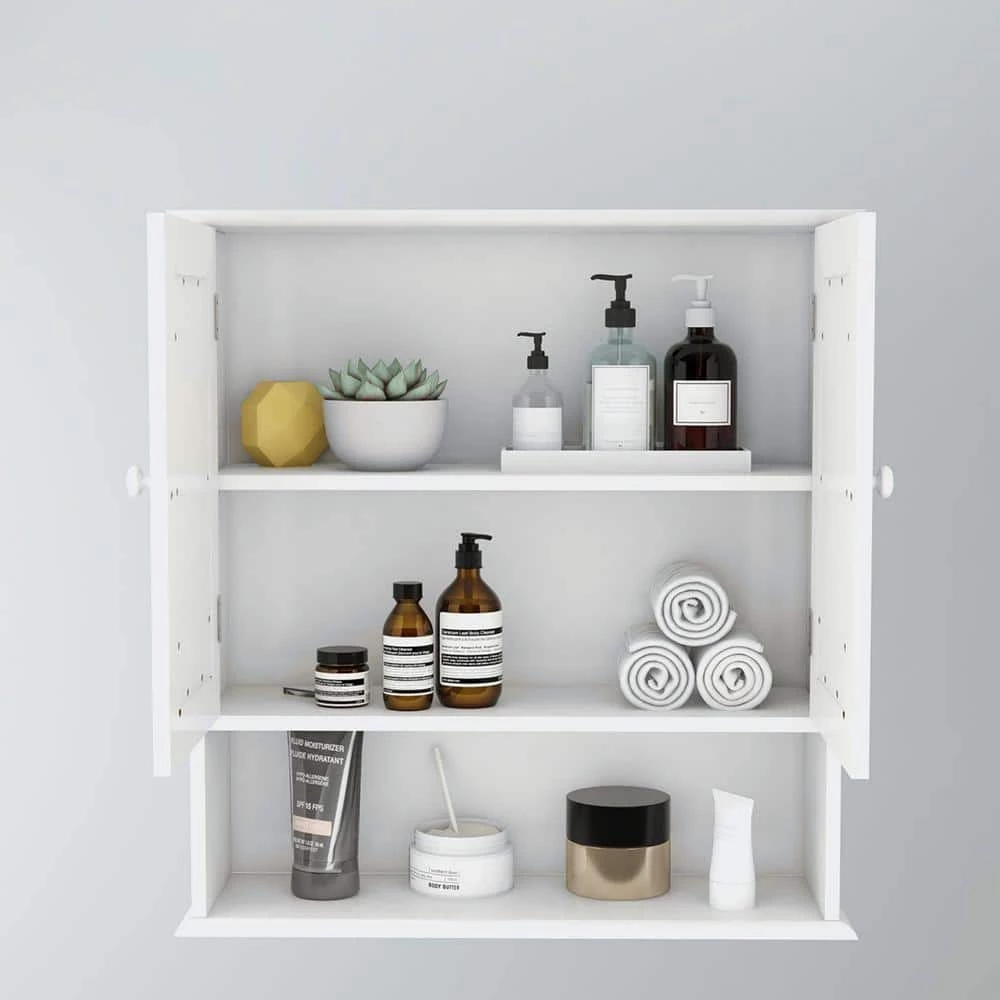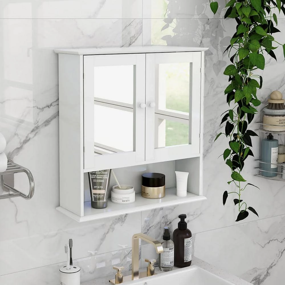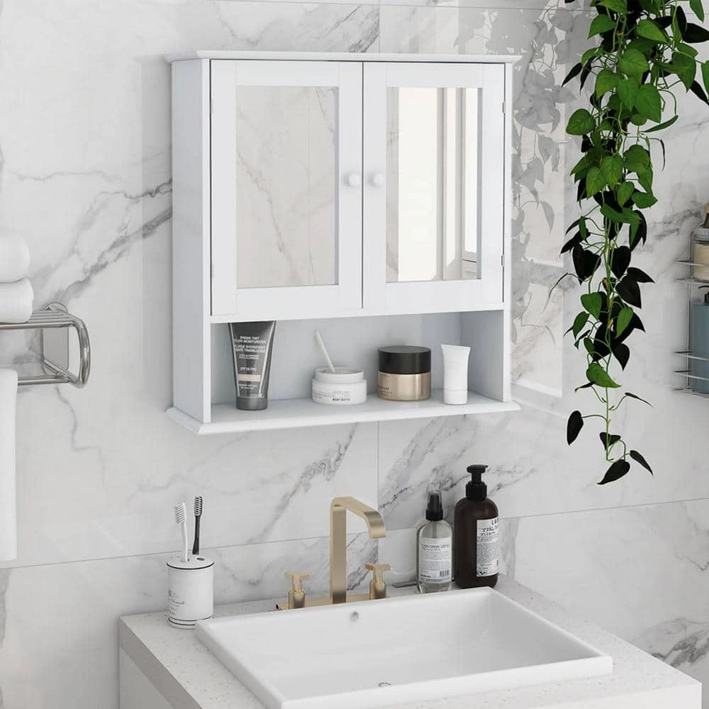 Selling Features. Multipurpose. The wall cabinet with mirror combined with modern style and simple storage space for bathroom. Features enclosed shelf with double shutter mirror doors, 1 open shelf to place towels, soap, tissues and other decorative items.