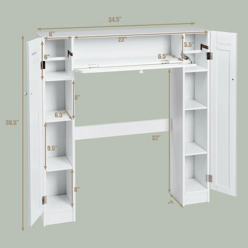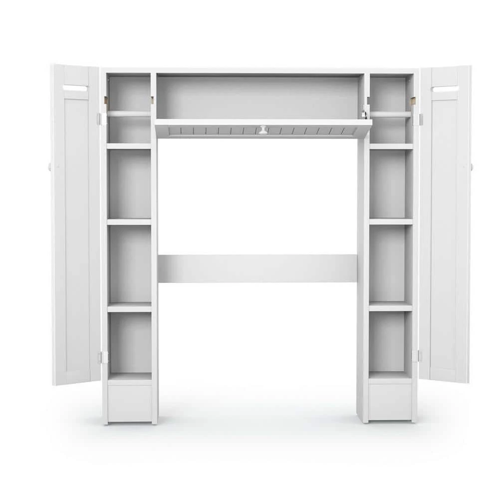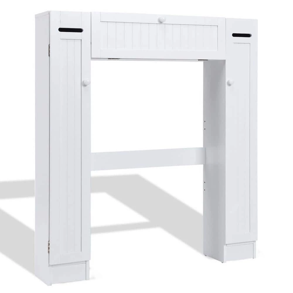 This new, intelligent and versatile bathroom space saver allows you to utilize extra space for all your bathroom storage needs. The generous center cabinets and two side cabinets allow you to organize and separate your personal products. There are a paper holder, one fixed shelf and two adjustable shelves behind each side cabinet. A pull-down door at the center is used for holding some bath items. The cabinet provides excellent storage solutions for bathrooms with limited space. This bathroom space saver features sturdy MDF construction, and its white finish ensures that it will match and accent any existing decor. It is a free standing furniture piece, which conveniently fits over standard toilet tanks and add easy storage for roll paper and other bathroom necessities. If this is just what you are looking for, don’t hesitate to buy it.