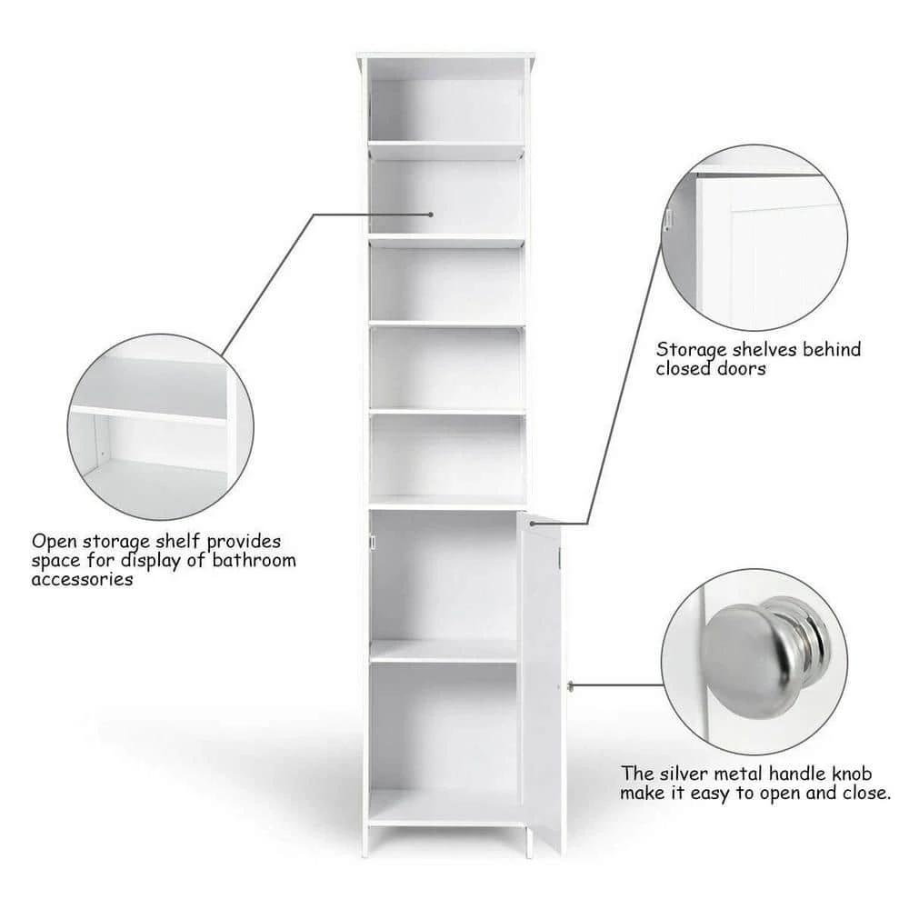 This is our new brand and high quality bathroom high cabinet which provides the perfect solution to your storage problems. The bathroom cabinet offers large storage capacity in a compact space so it can help you save space. It is ideal for bathroom, hallways, kitchens and beyond. Equipped with 5-shelf provide plenty of room to storage your items and a door with silver metal handle knob can keep your personal item safe. What’s more, it has movable shelves so that you can adjust the distance between layers according to your needs and the anti-dumping design can protect your safety. Don’t hesitate to buy one.