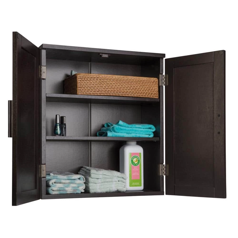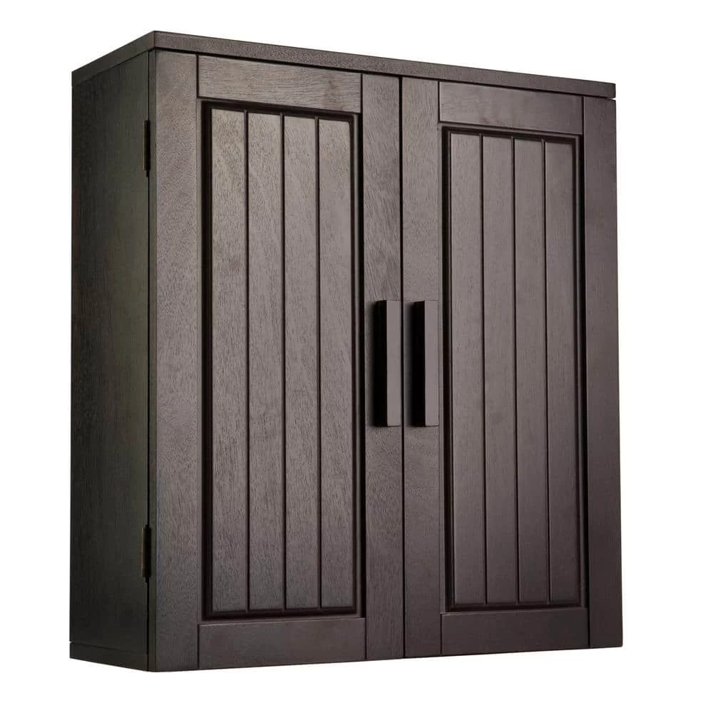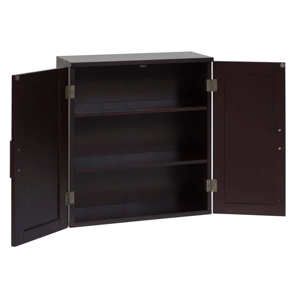 Combine style and storage in your bathroom with the Americana Wall Cabinet in Dark Espresso from Elegant Home Fashions. The cabinet features stylish crown moulding and 2 adjustable shelves that easily accommodate items of different sizes. Both wooden doors are crafted with a simple, straight-line colonial design and include stylish wooden door handles for easy access. Complete with a rich espresso finish, the cabinet is constructed with sturdy MDF and comes with all hardware needed for assembly.