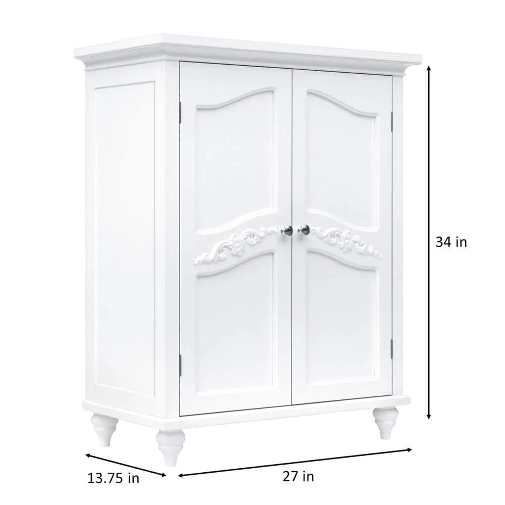 “Upgrade your home storage while adding classic style with the Elegant Home Fashions Versailles Wooden Floor Cabinet with 2 Shelves. This decorative cabinet features a white finish with a crown molded top, metal knobs, and engraved doors for a timeless addition to your space. The 2 included adjustable shelves make this cabinet functional and customizable to suit your storage needs. Constructed from durable engineered wood, this storage unit is built to provide you with long-lasting organization. Easy, step-by-step instructions and all of the hardware needed for installation are included for quick assembly. Purchase this stylish floor cabinet alone or with other items from the Versailles collection for a cohesive, updated look. The Elegant Home Fashions Versailles Wooden Floor Cabinet with 2 Shelves measures 13.75″” x 27″” x 34″” to provide accessible storage without taking up too much space in your living area or bathroom. An affordable extravagance. Elegant Home Fashions has been the nation’s foremost manufacturer of bathroom accent furniture and bathroom accessories among the United States. Their customers include some of America’s finest and most prestigious retailers, department stores, and discount retail chains. Elegant Home Fashions products have traveled the globe to focus on giving their consumers, the best quality and design for their bathroom decor.”