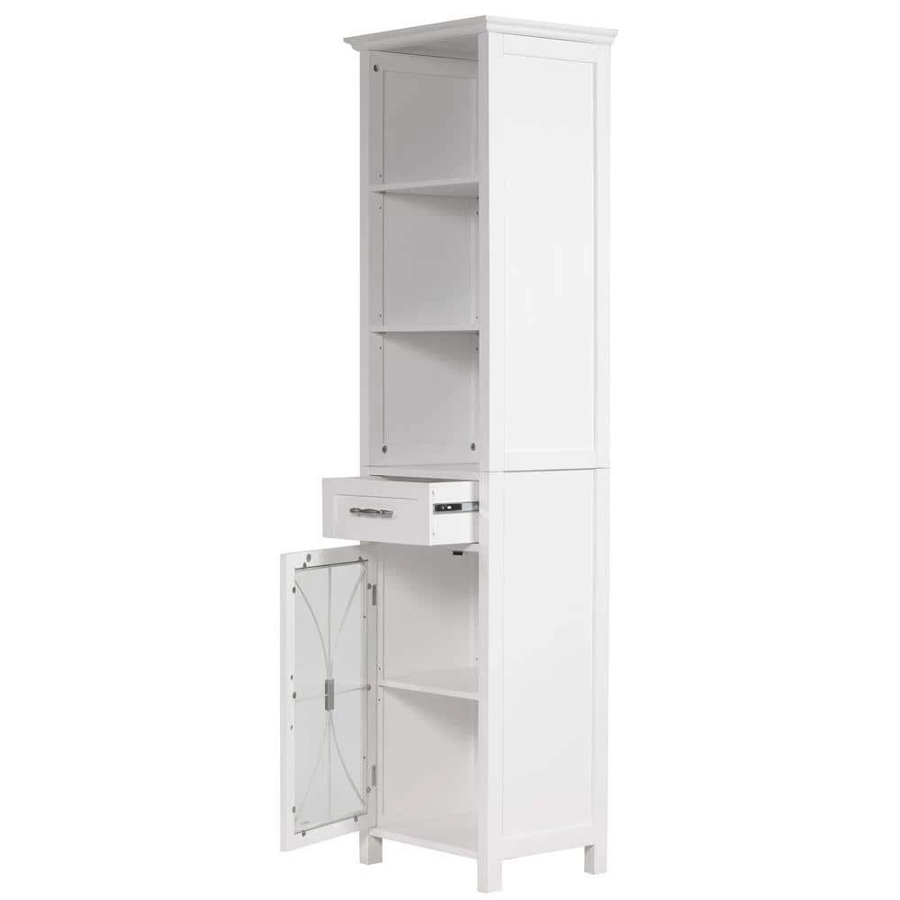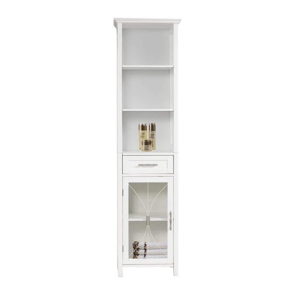 The Delaney Linen Tower Cabinet offers timeless style, quality and organization for your home. Finished in white, this bathroom cabinet features elegant crown molding, a door with tempered glass inlay and cathedral-style wire accents, adjustable open shelves, and a metal glider drawer. Suitable for storing linens, this floor cabinet is also great for organizing toiletries, pharmaceuticals, and many other household items. Made from engineered wood, comes with assembly hardware. 7978 7978