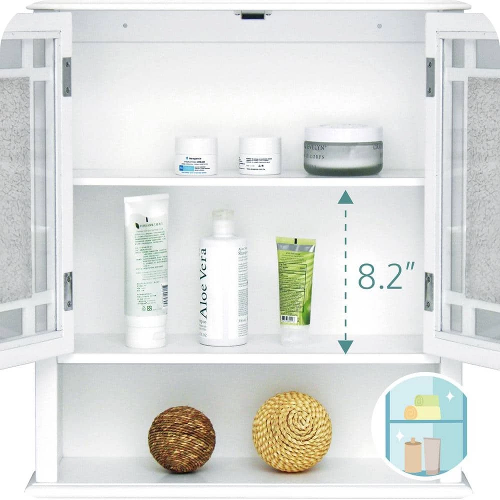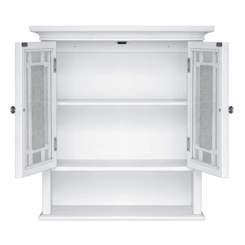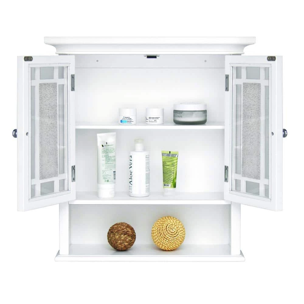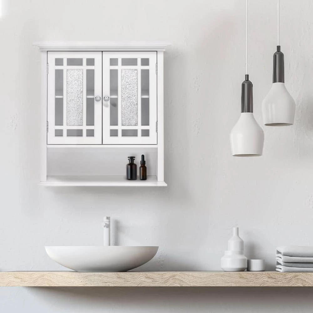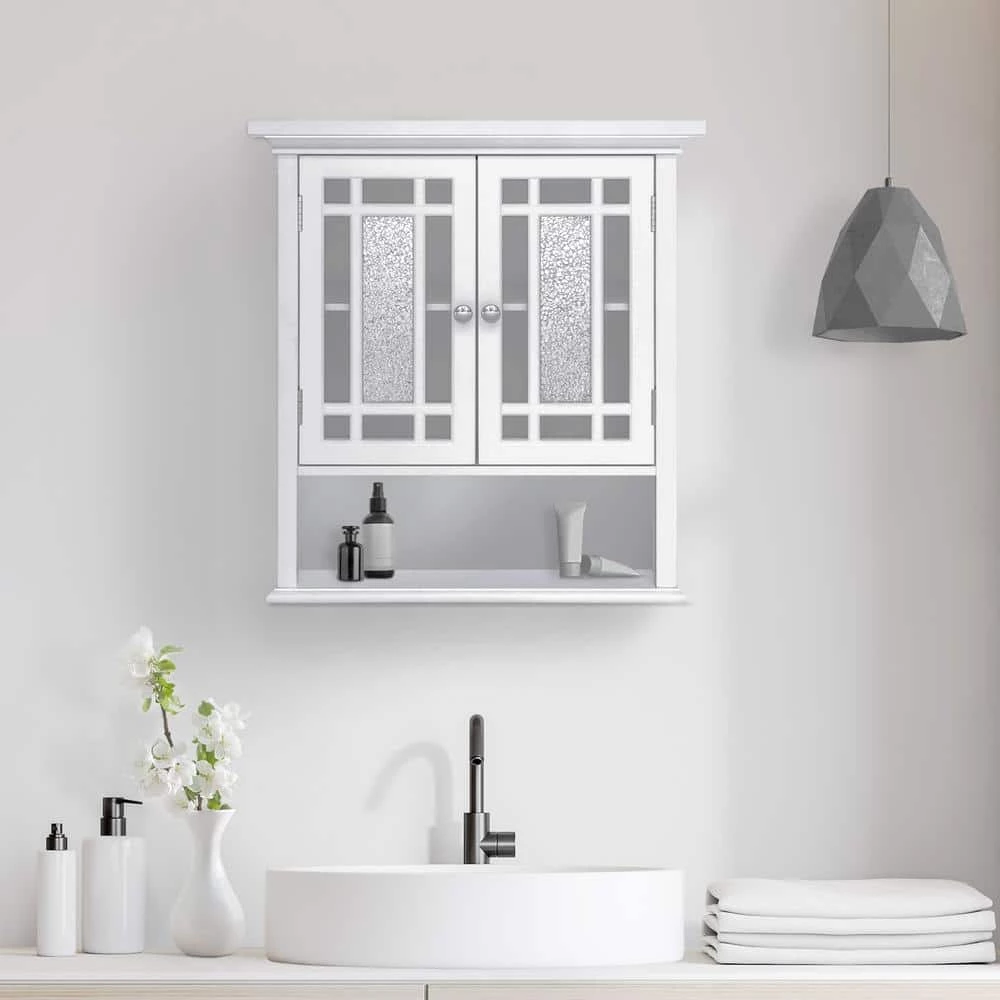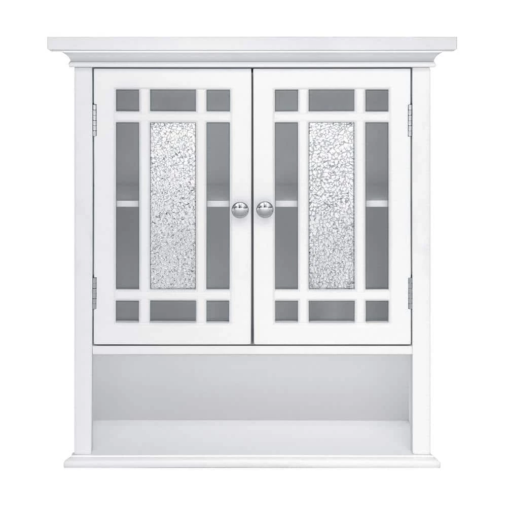 The Winfield Wall Cabinet has sleek lines for a modern look. This cabinet features two glass doors centered with silver mosaic glass accented with grid-work design and beveled molding. This unit offers plenty of storage space with one open shelf and one interior adjustable shelf making it easy to store items of different heights. Crystal clear door knobs showcase the modern design. This cabinet comes with assembly hardware.