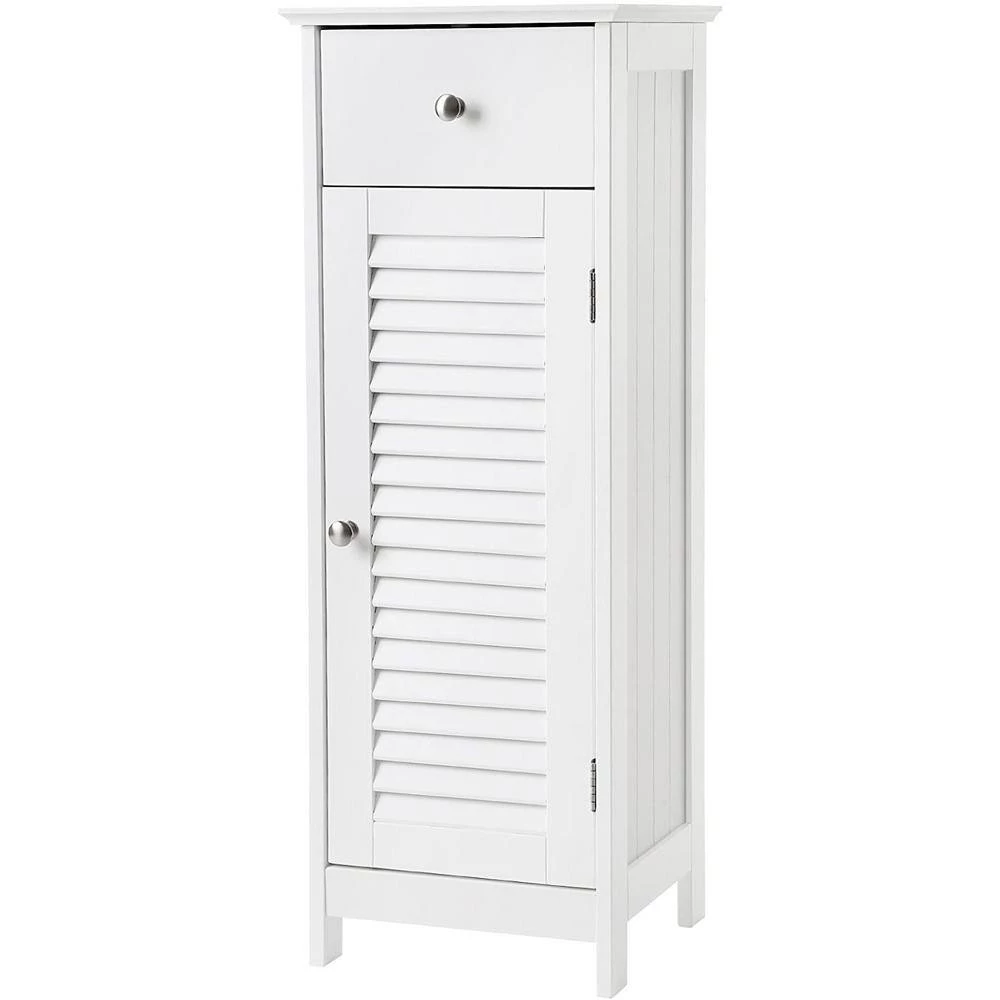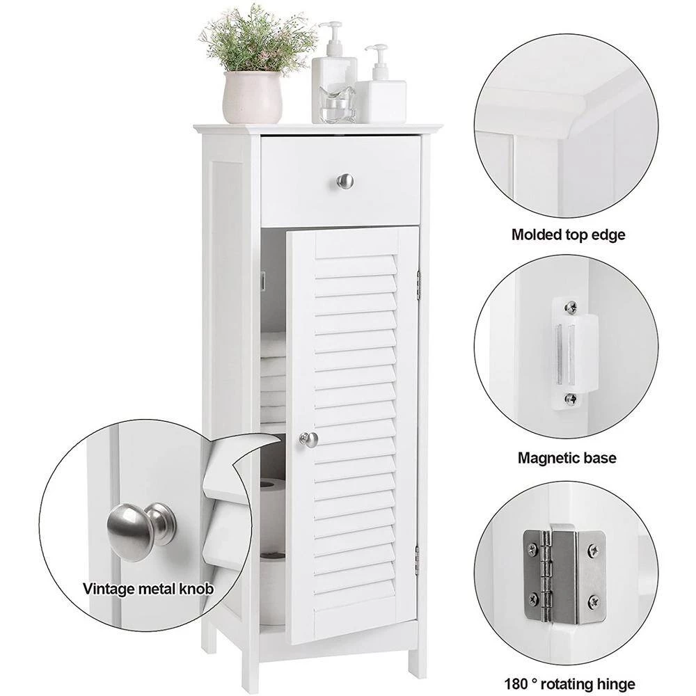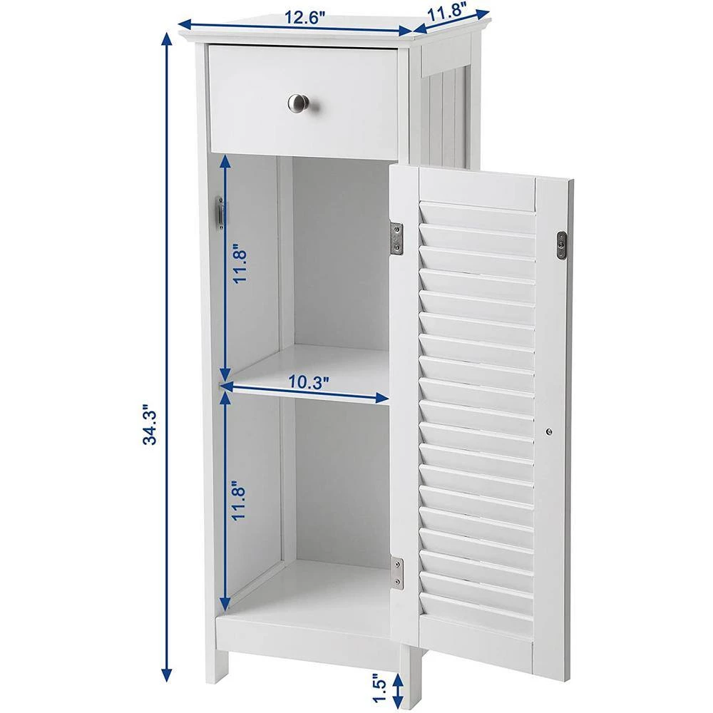 - Space saver with large storage capacity: slim bathroom cabinet corner unit sized 12.6 in. L x 11.81 in. W x 34.25 in. H makes full use of limited space; ample storage space provided by a drawer and a single shutter door cupboard with 2 compartments
