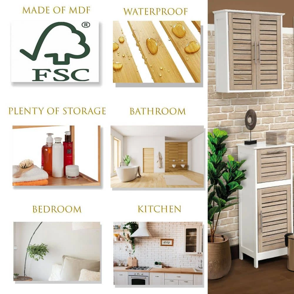 - MADE OF WOOD/MDF: This wall mount cabinet is made of white and oak-like painted sturdy wood (MDF). The 2 doors have an easy opening with U-shape cutout handles. Also, the louvered doors ensures a good air flow and are magnetized to stay securely closed