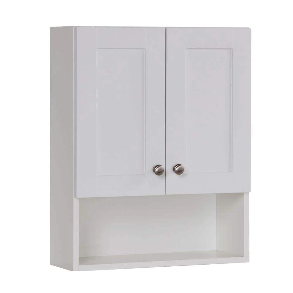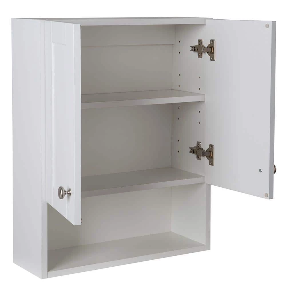 The Glacier Bay Del Mar 20-1/2 in. W Over John Wall Cabinet in White has a Shaker-inspired design that will give your bath or powder room decor a classic look. Durable and sturdy, this cabinet has plenty of versatile storage space with two interior adjustable shelves and a single open shelf below. The brushed nickel hardware perfectly complements the fresh white finish, while hidden adjustable hinges provide a clean and seamless look. Perfect for smaller spaces, this cabinet is easy to install and coordinates with the Del Mar Vanity and other pieces from the Del Mar Collection. Limited lifetime warranty.