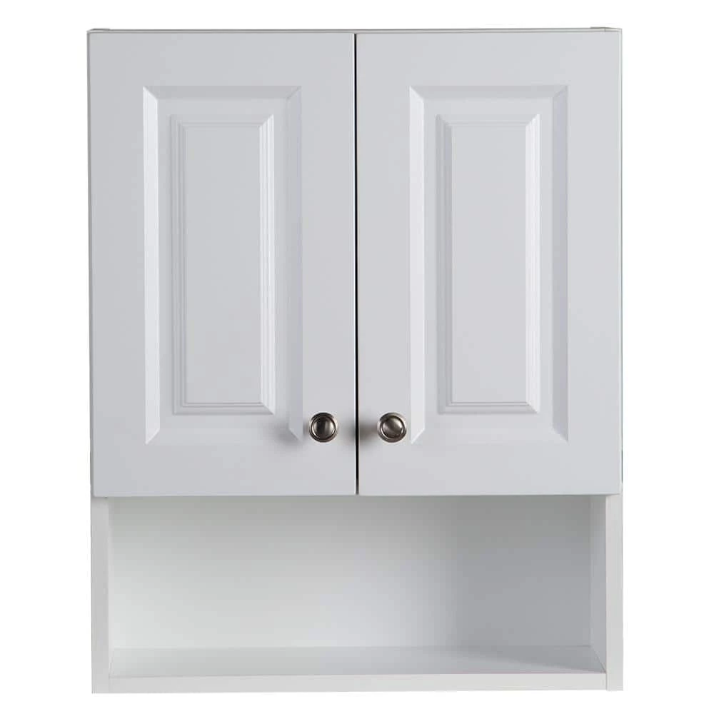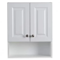The Lancaster 25 in. H White storage cabinet features durable construction for furniture-quality bath storage. The raised panel door style design help bring style and sophistication to your bathroom while the white color matches many home interiors. The lovely Lancaster wall cabinet comes with one adjustable shelf in order to provide ample bathroom storage space with stunning brushed nickel cabinet hardware in order to help add a touch of style to your home decor.