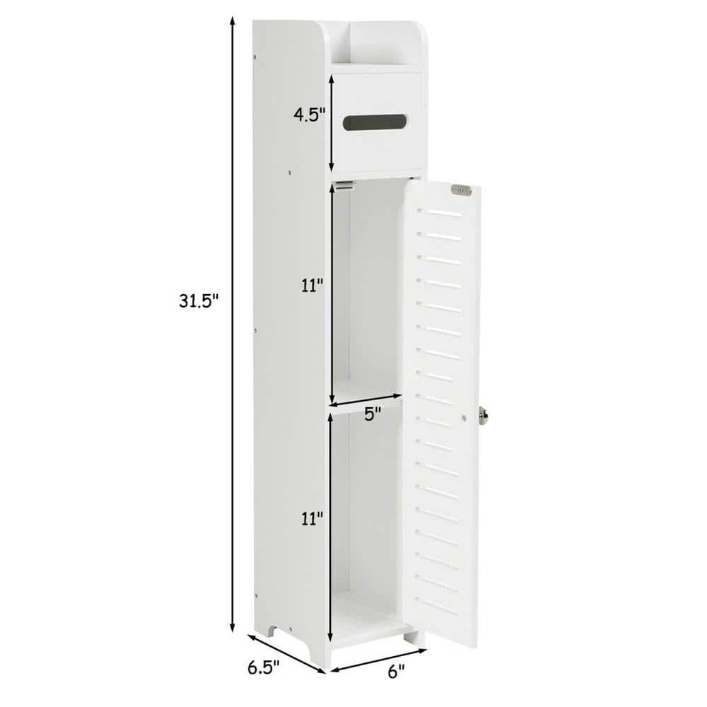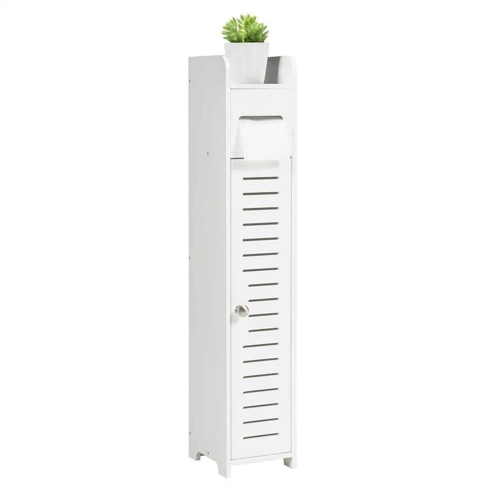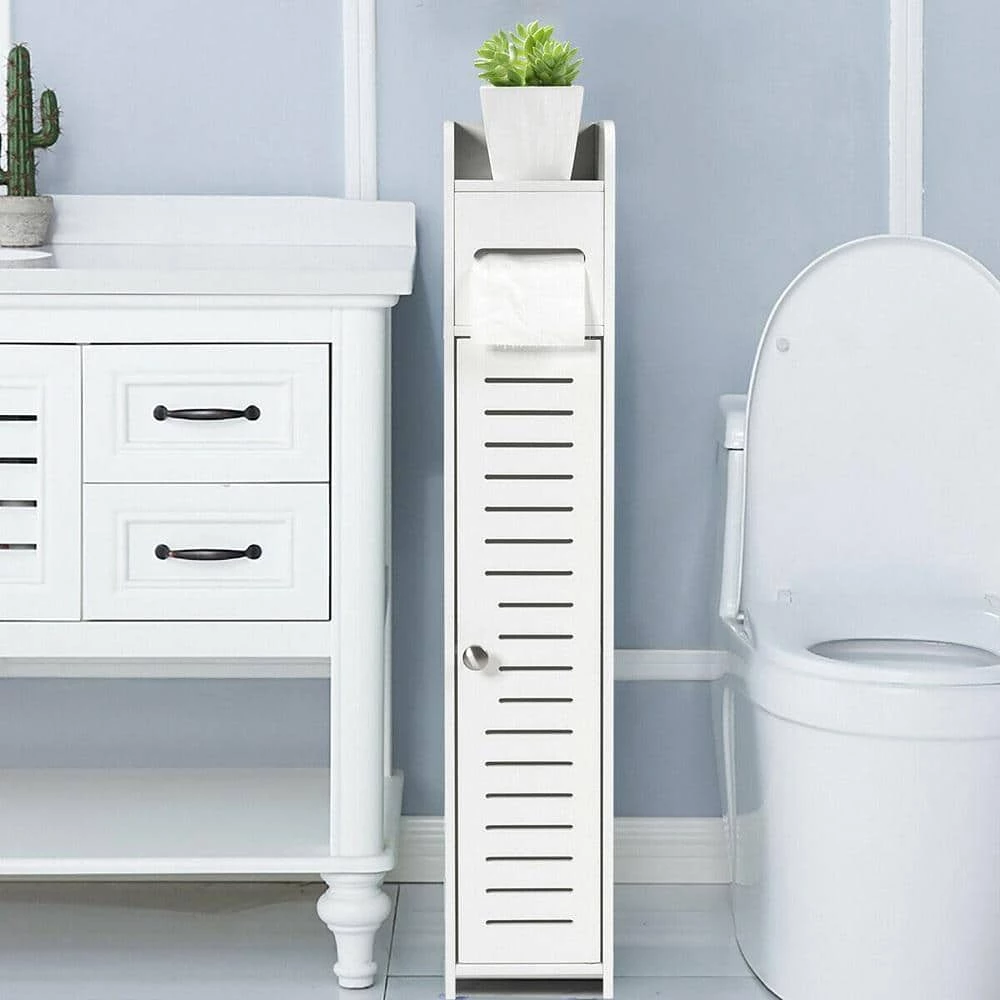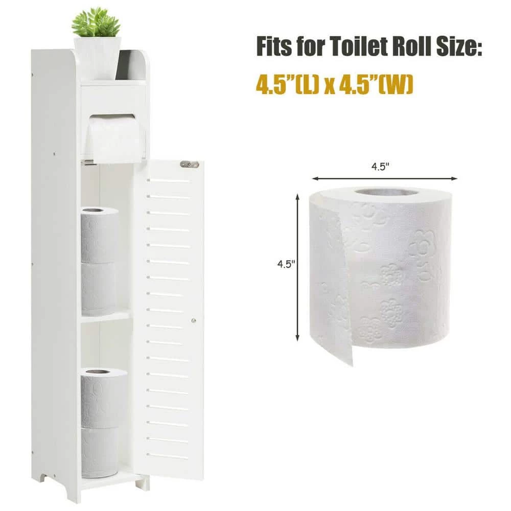 This tissue corner stand cabinet offers ample storage space with 1 top tissue compartment, 2 bottom shelves, which are fairly enough for your bathroom essentials including 4 paper rolls or 3 bottles of medium capacity shampoo. The height of the tissue box is suitable for majority of people, and top shelf is just fit enough to hold your mobile phone when you need some place for it. It is purpose in a slim space at a great value, fit the perfect size between the sink vanity and toilet, between the wall and dryer, between the toilet and the tub. And the smooth surface makes it easy for you to clean it up. This sturdy and durable bath tissue storage cabinet will definitely meet your bathroom storage needs.