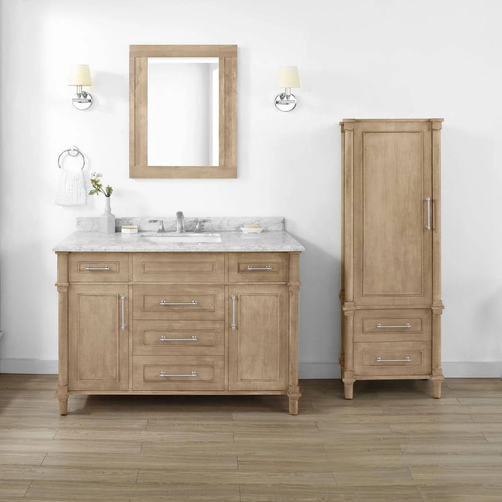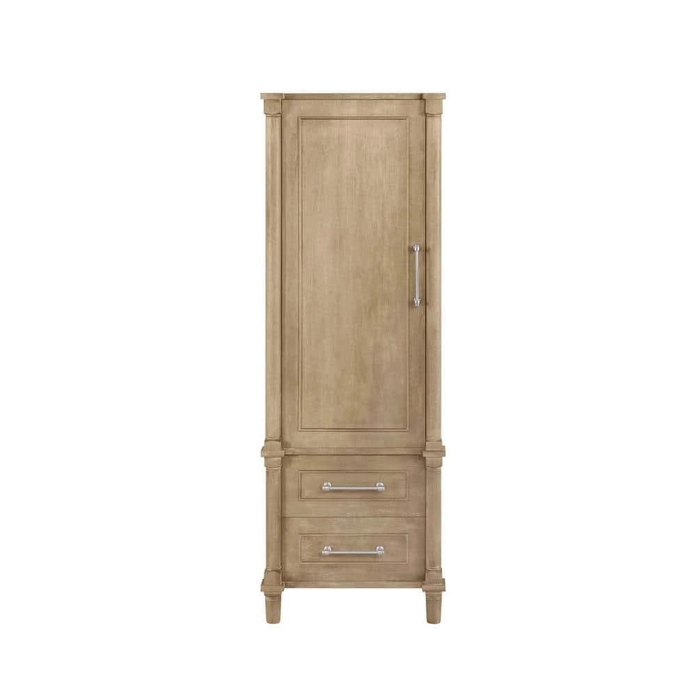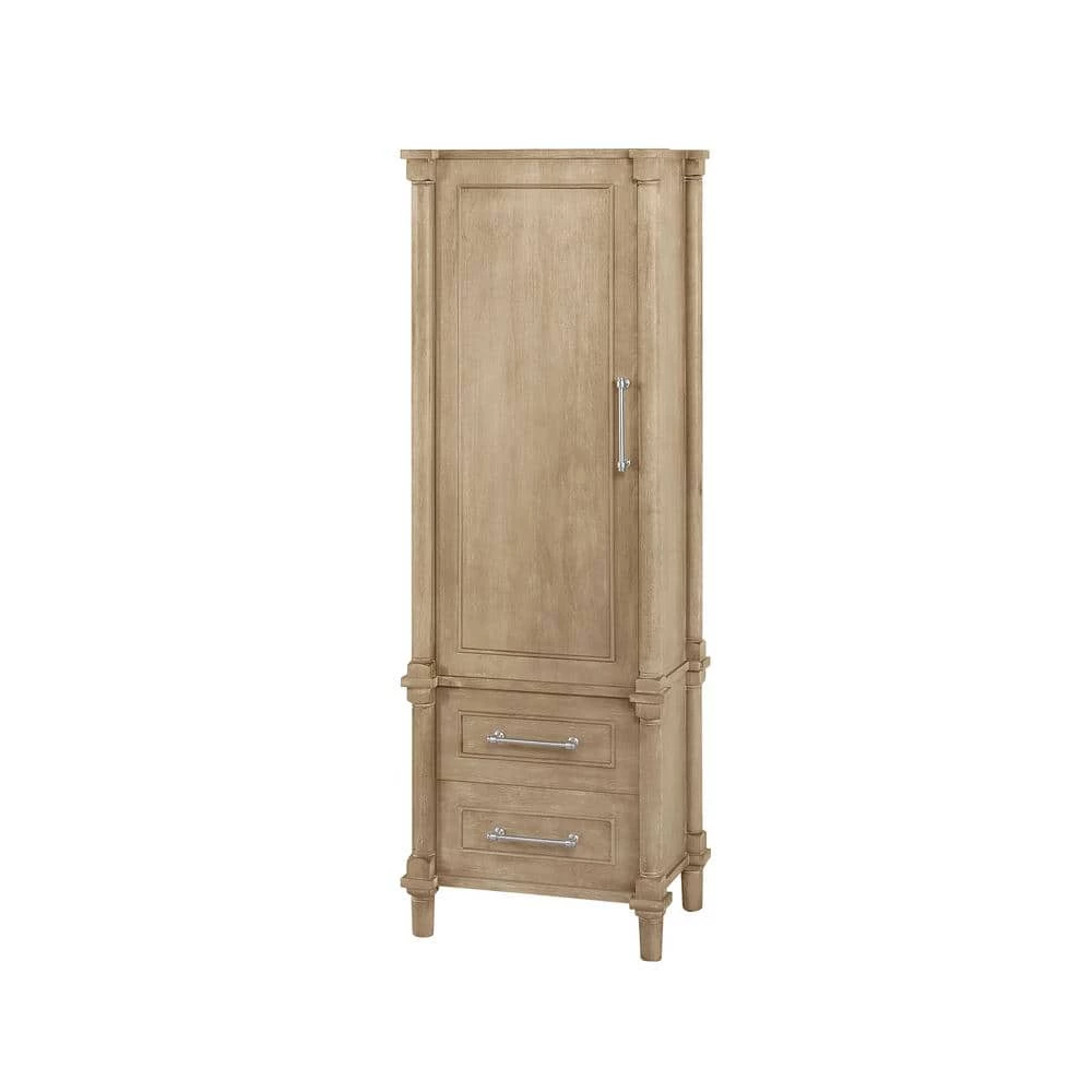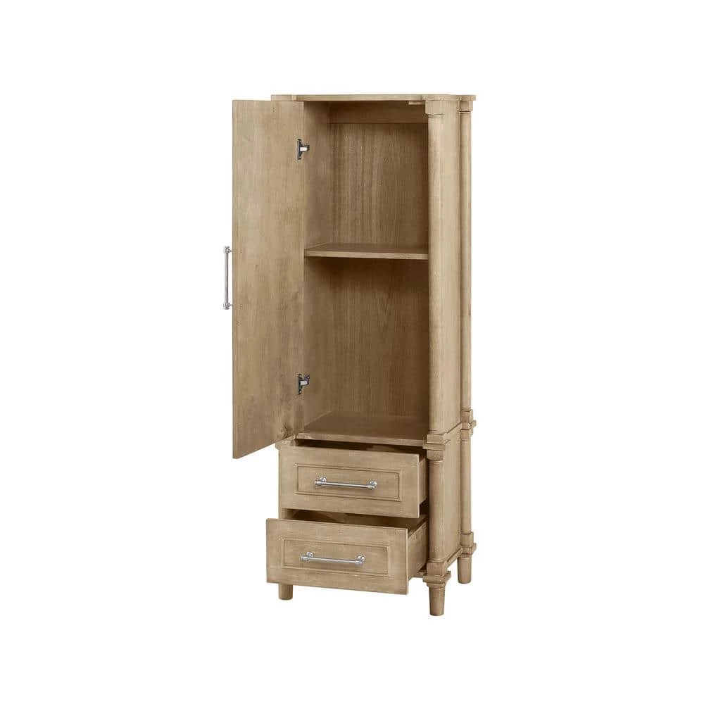 Stately elegance informs every detail of the freestanding Aberdeen 14 in. wide by 60 in. high bathroom side unit storage cabinet by Home Decorators Collection. Its carefully constructed antique oak wood stained cabinetry features handsome trim, column legs and designer brushed nickel hardware. Discover plenty of storage in its spacious single door top cabinet with 2 shelves plus two bottom drawers. Coordinates beautifully with the Aberdeen bathroom vanity collection, available in a range of color finishes and sizes from a space saving 24 in. wide powder room design to a luxurious 72 in. wide double vanity.