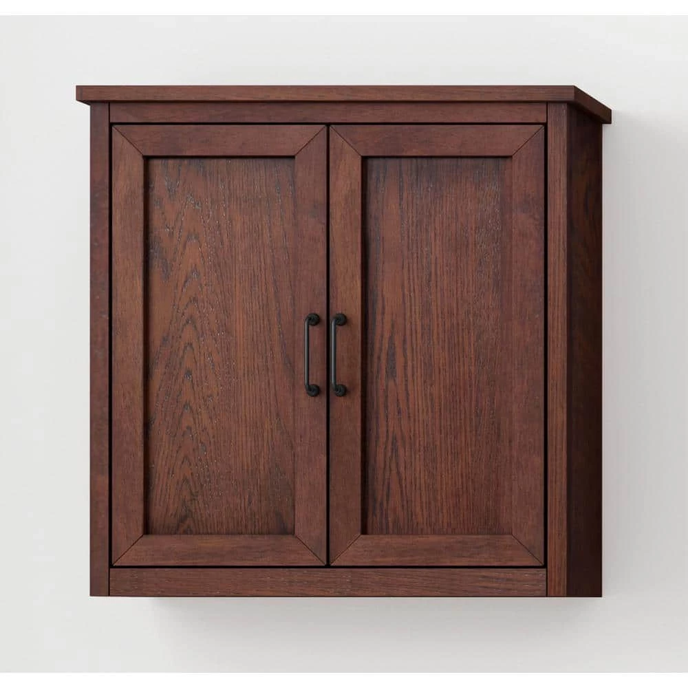 Alster 25 in. W x 8 in. D x 26 in. H brown 2 doors bathroom storage wall cabinet in brown oak combines function with style. The linen tower is designed with strong attractive lines and finished in brown oak with matte black finish pulls. It is constructed of solid rubber wood and veneer with soft-close door hinges. It features 1 shelf to accommodate all your storage needs.