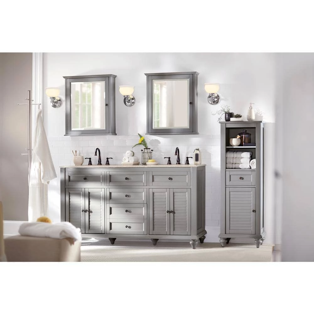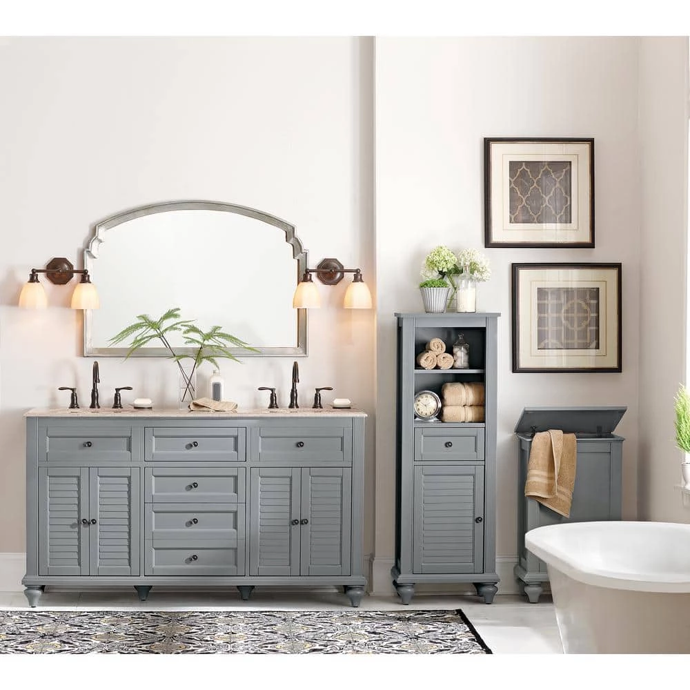 Turned feet, a louvered door, recessed panels and simple molding bring classic cottage appeal to the Hamilton Bathroom Linen Storage Cabinet from Home Decorators Collection. With two shelves, a drawer and a lower cabinet, you’ll have plenty of space to store and display your bath essentials. Stack your towels and washcloths, display collectibles or simply keep clutter out of sight with this versatile design.