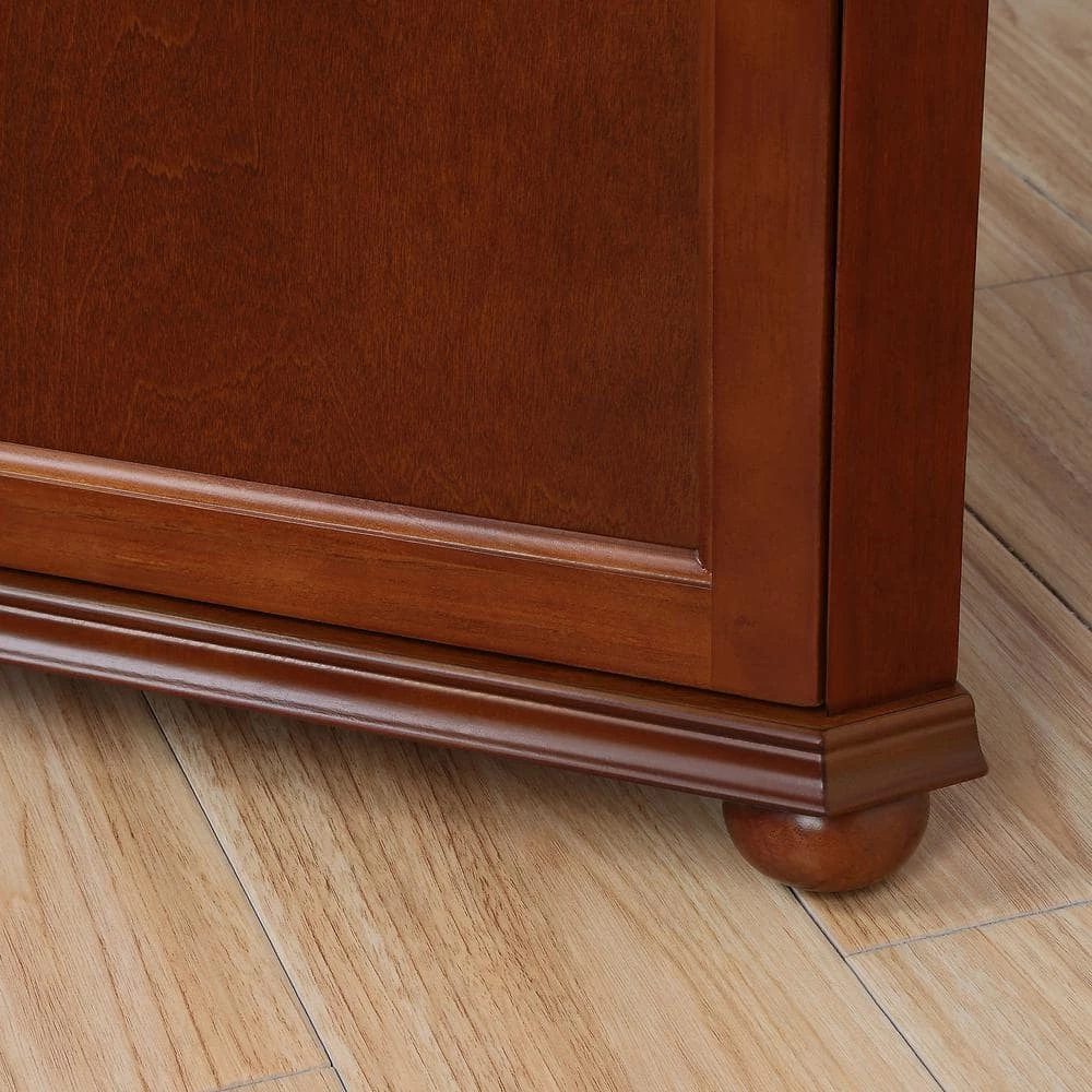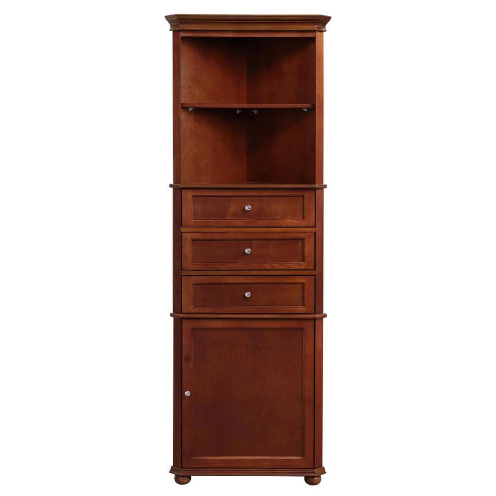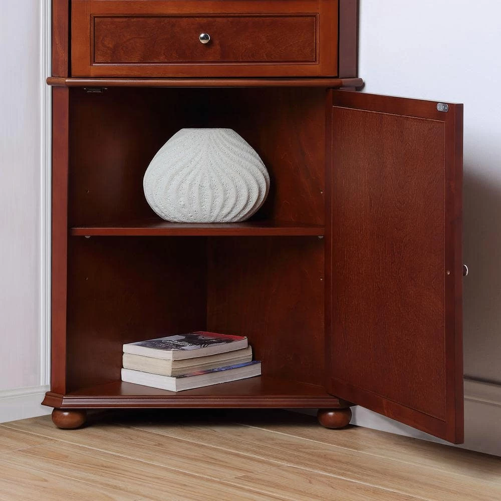 Enjoy the sleek, classic styling of the Hampton Harbor Corner Linen Cabinet in Sequoia from Home Decorators Collection. Keep your linens neatly organized in the interior compartments while storing accessories on the adjustable shelves. The cabinet slides easily into a corner for a cozy, space-saving look that offers a warm and elegant touch for any space. Crafted with extra-dense, no-warp wood composite and veneers on a solid wood frame, then given a stunning sequoia finish and traditional decorative accents, this bathroom storage cabinet is carefully designed to withstand the rigors of everyday use while enhancing your room’s style.
