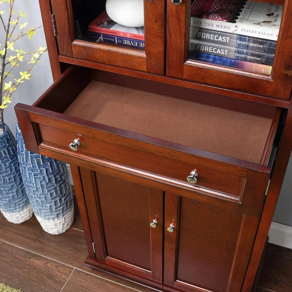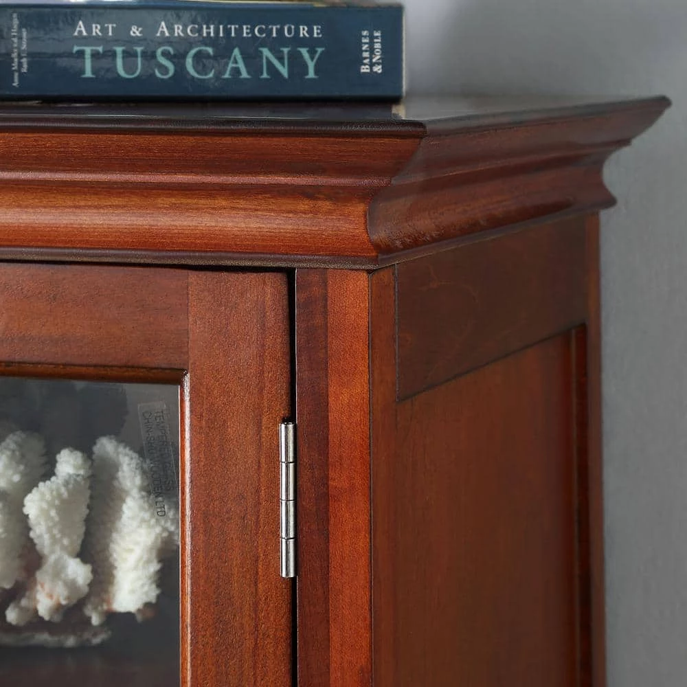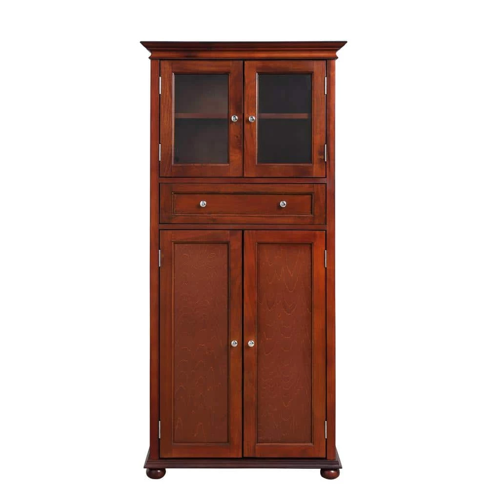 Express your sense of style with the charming Linen Cabinet in Sequoia from Home Decorators Collection. Finished in a stunning glossy sequoia tone, this versatile cabinet is great for the bathroom, living room or dining room. Designed to maximize your vertical space, it includes two upper glass doors, one drawer and two lower doors that open to reveal ample interior storage. Perfect for linens, china, bathroom necessities and other household items, the cabinet is crafted with solid wood and veneer for durable, lasting beauty.