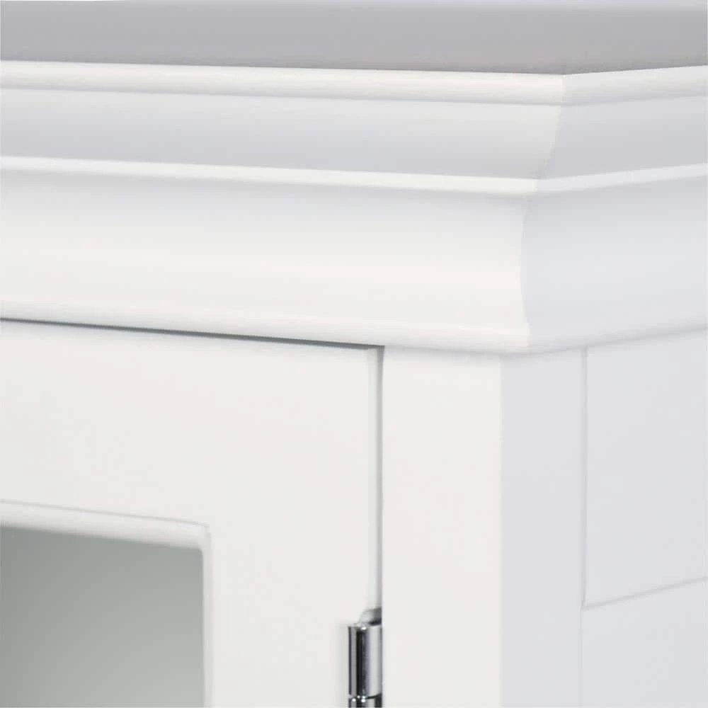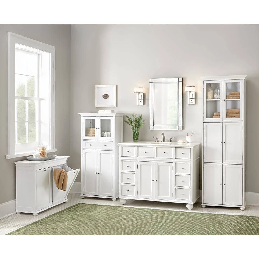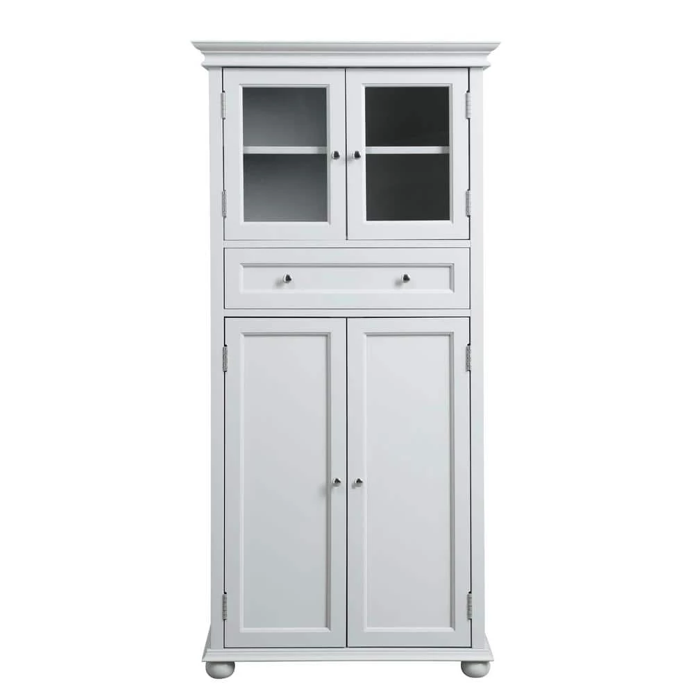 Create more room in your home with the Hampton Harbor Linen Storage Cabinet in White from Home Decorators Collection. Durably crafted from extra-dense, no-warp wood composite and beautiful veneer on a solid wood frame and given a versatile white finish, this cabinet is sure to brighten any room. Store belongings in the drawer or behind two sets of easy-access doors. The top set of doors features tempered glass panels for easy visibility. The cabinet features distinctive details including chrome-finished hardware, bun feet and a recessed panel design, creating a piece that is both decorative and fully functional.