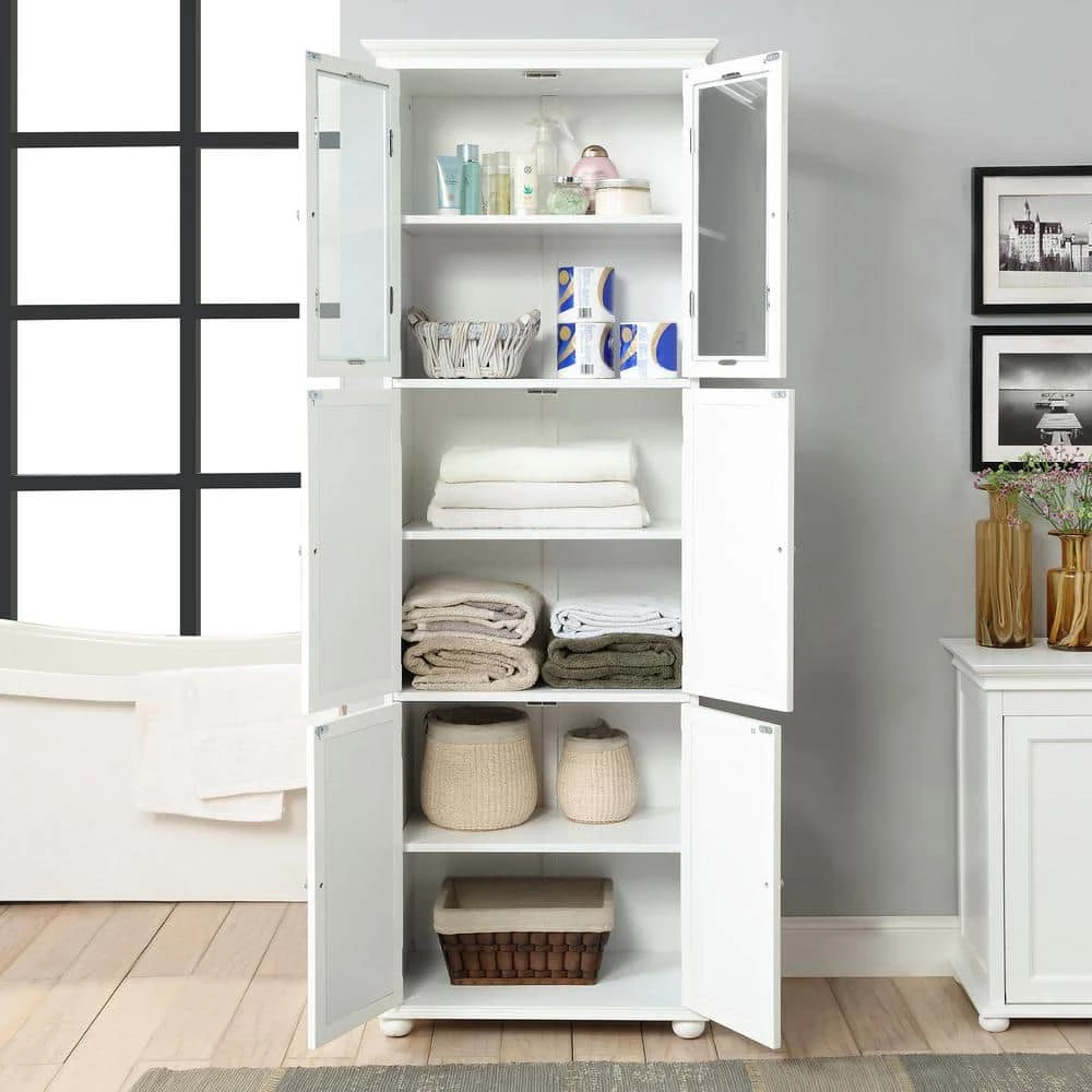 Consider a tower storage unit for stashing toiletries. A tower like this one, constructed of manufactured wood, is perfect for a bathroom thanks to its narrow measurements. It features two types of shelving: a glass cabinet perfect for displayable bathroom essentials, and a lower cabinet ideal for linens and more. We recommend putting this piece together with a friend.