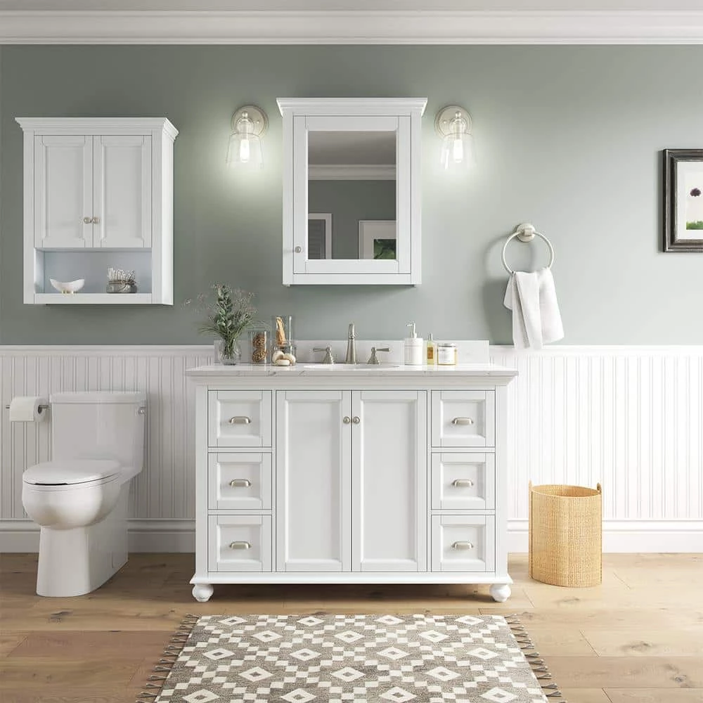When you’re looking to add more storage to your bathroom, there is nothing better than a modern take on a classic design. The Lamport Wall Cabinet by Home Decorators Collection is just that. Durably built, this wall cabinet features a medium density fiber board frame, an open bottom shelf for decorative storage space, and crown molding. One interior adjustable shelf give you the flexibility to fit all of your necessities easily. The Lamport Medicine Cabinet arrives full assembled with the mounting hardware pre-attached for ease of installation. Rethink your storage and brighten up your bathroom with the Lamport Wall Cabinet.