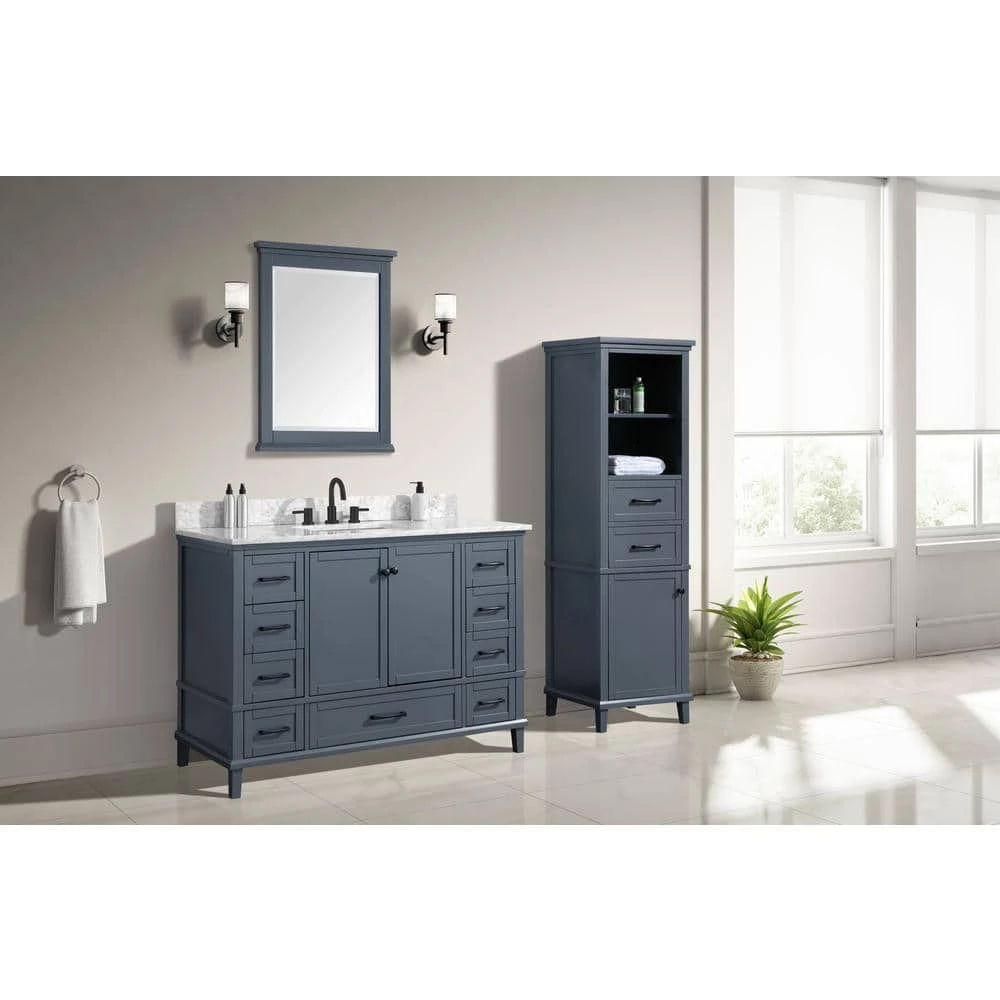 Restore beauty to your bathroom with the Merryfield 20 in. W x 16 in. D x 65 in. H Floor Linen Tower in Dark Blue-Gray. Black finish hardware, ample storage space, soft-close glides and hinges and a solid wood frame attest to the exceptional build of this cabinet. Combine it with the Merryfield collection of vanities or as a standalone item.