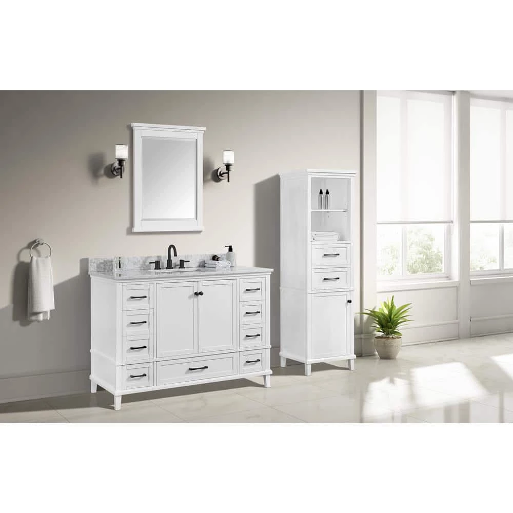 Restore beauty to your bathroom with the Merryfield 20 in. W x 16 in. D x 65 in. H Floor Linen Tower in White. Black finish hardware, ample storage space, soft-close glides and hinges and a solid wood frame attest to the exceptional build of this cabinet. Combine it with the Merryfield collection of vanities or as a standalone item.