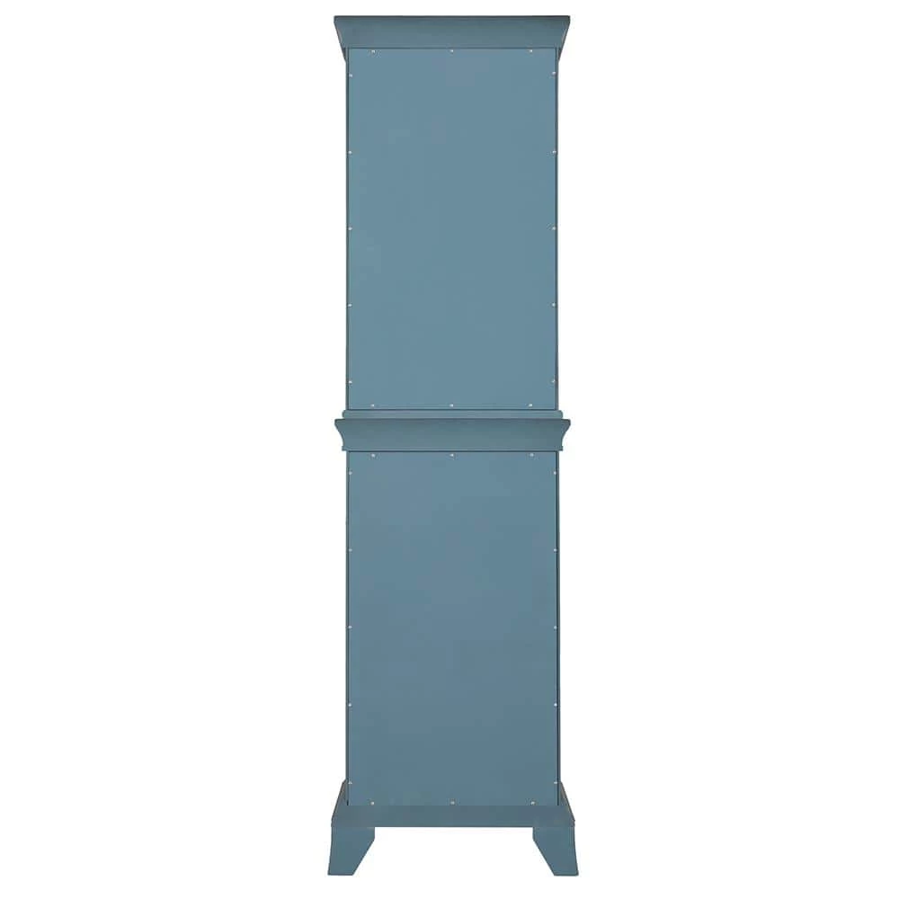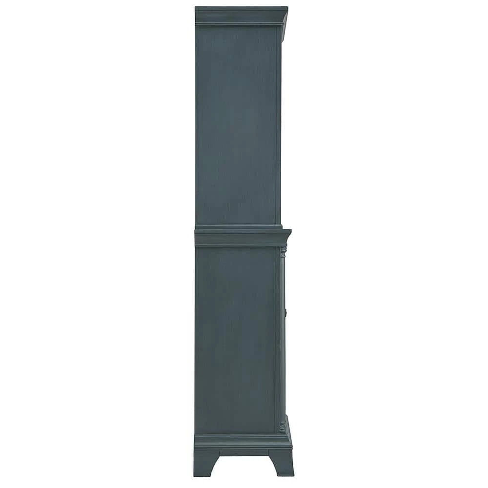 Make an upscale, elegant impression with the 72 in. tall Strousse linen cabinet This intriguing Distressed Blue Fog finish cabinet features open shelving, a cabinet with an adjustable interior shelf, and a full extension soft-closing drawer to solve all storage needs. Dark Pewter round knobs give sharp contrast, while stately columns round out this furniture-style piece. Create a complete bathroom that leaves visitors envious with this linen cabinet and all its coordinating pieces in the Strousse collection.