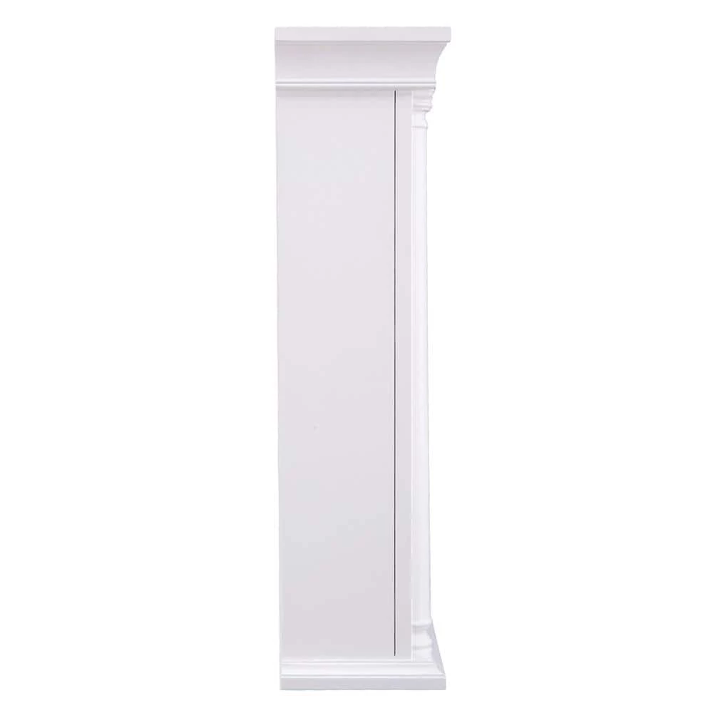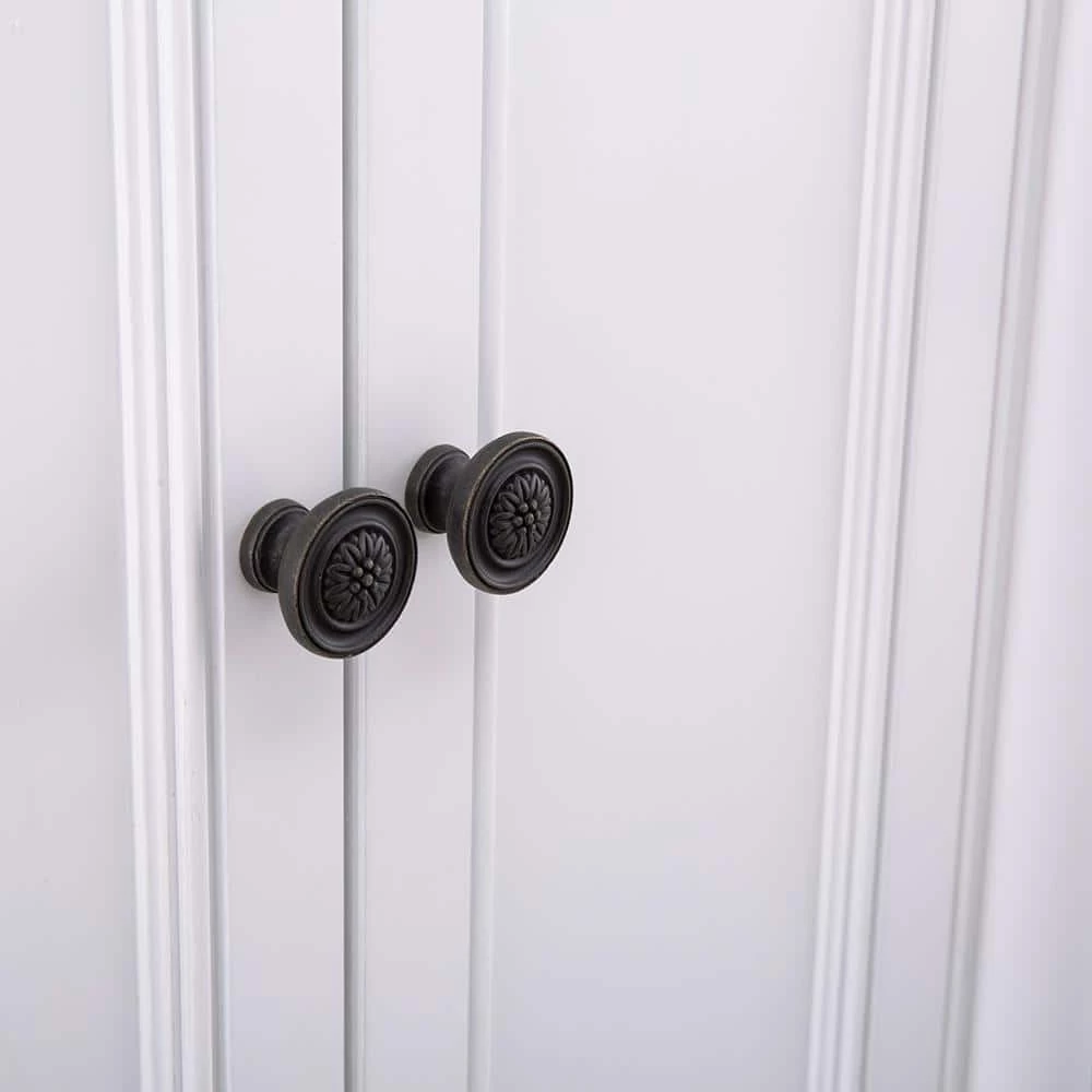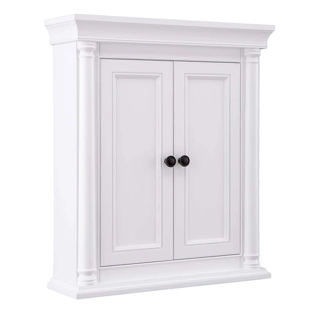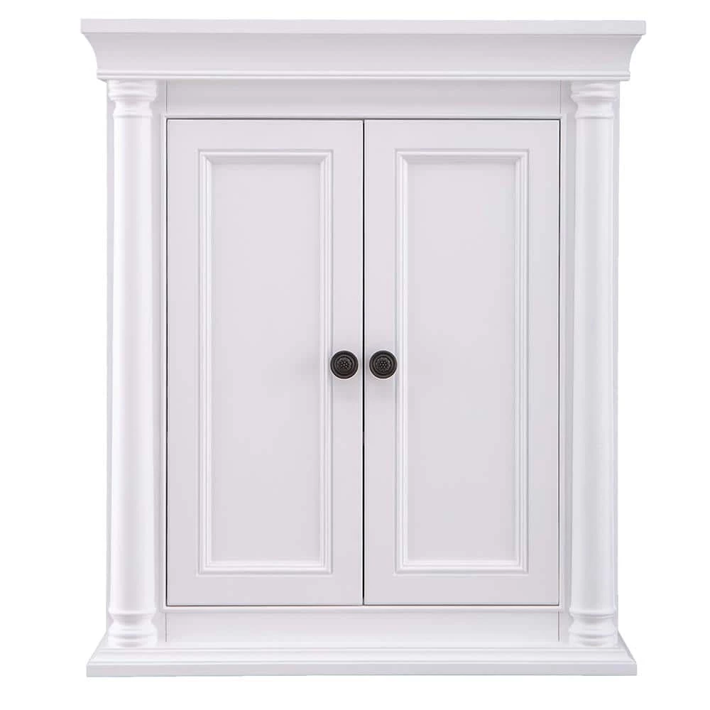 With a pristine White finish, the Strousse wall cabinet makes an upscale, elegant impression and a perfect complement to the Strousse vanity. Featuring 2 interior adjustable shelves, you will keep bath necessities neatly tucked away behind a set of slow-closing doors. Dark Pewter round knobs give sharp contrast, while stately columns round out this furniture-style piece. Create a complete bathroom that leaves visitors envious with this cabinet and all its coordinating pieces in the Strousse collection.