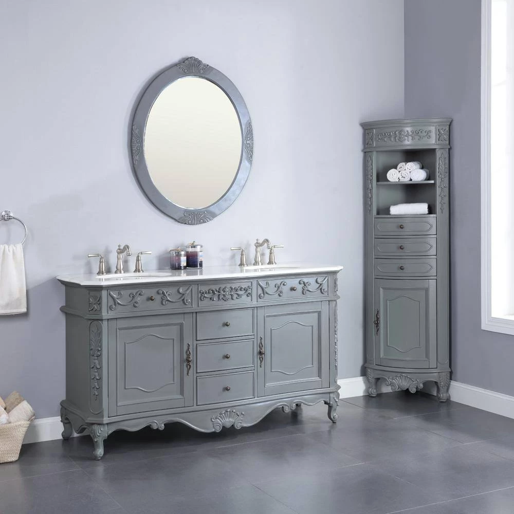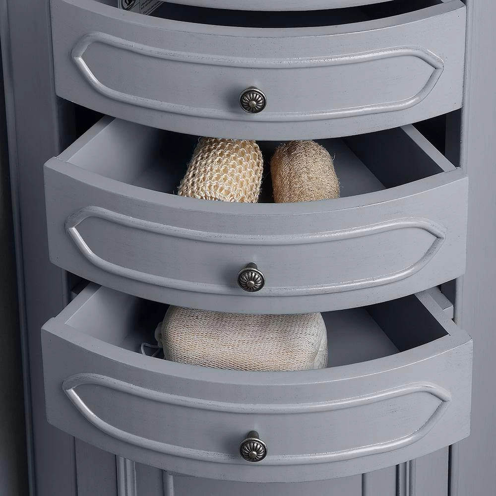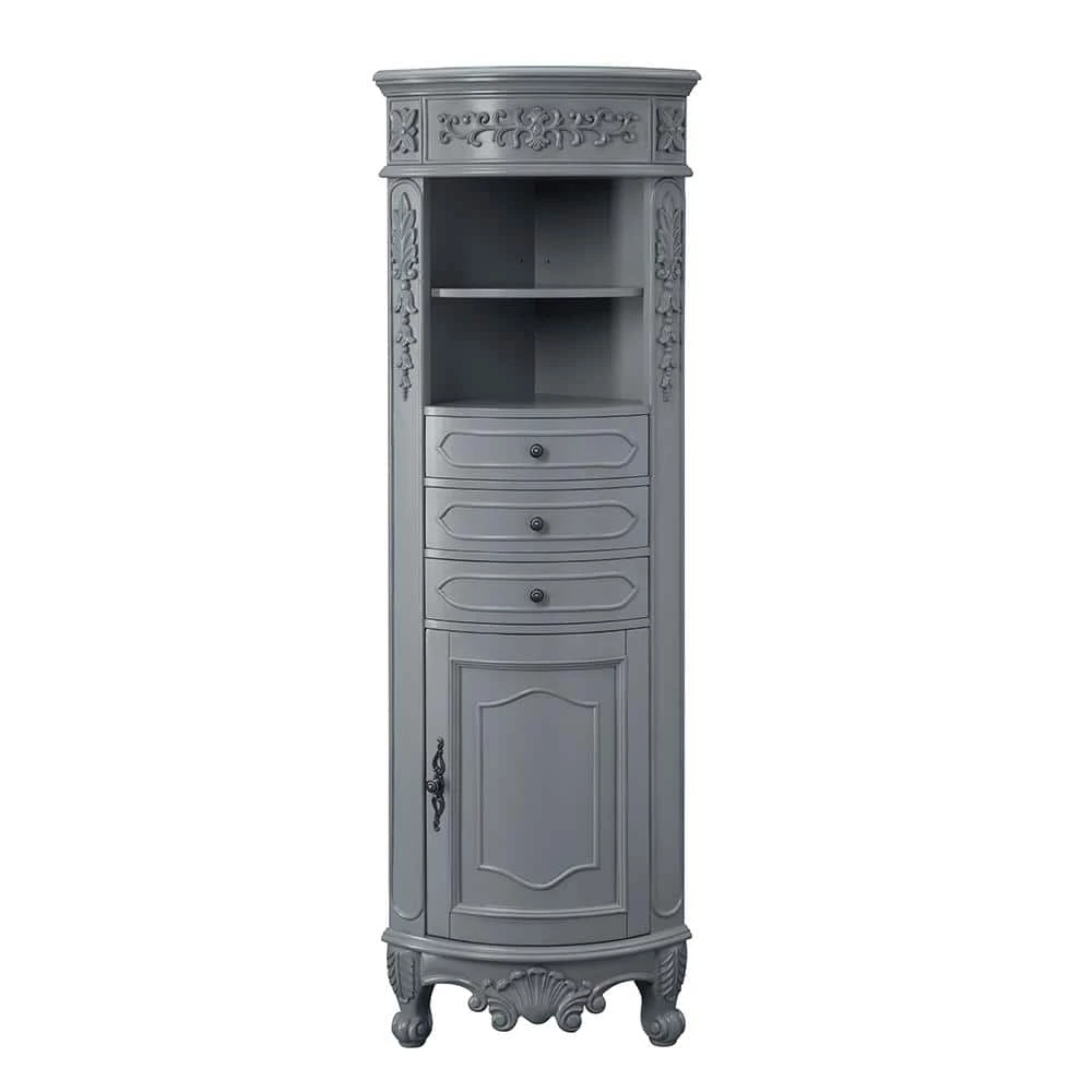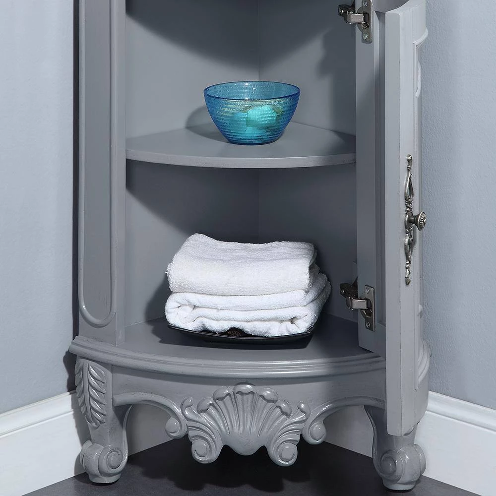 Our elegant Winslow Corner Linen Cabinet will bring traditional beauty to your bath. Nestle it into a corner to add just the additional storage you need with its open shelves, drawers and lower cabinet. This corner bath cabinet boasts elegant molding, embossed motifs, cabriole legs and ornate hardware in an antique finish.