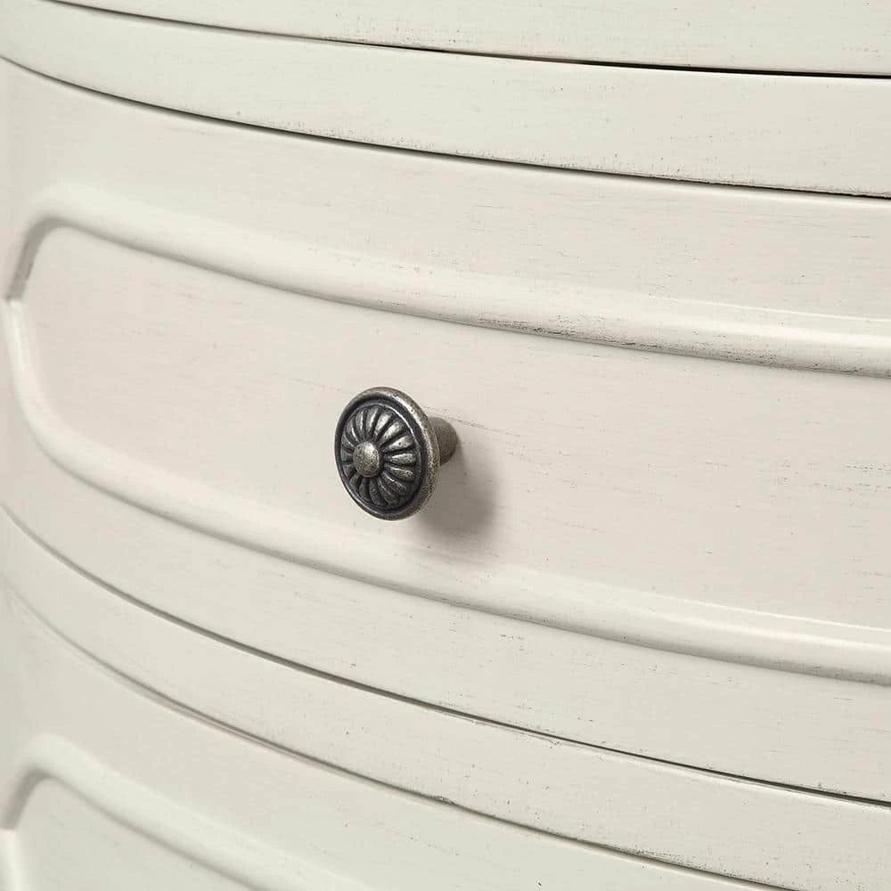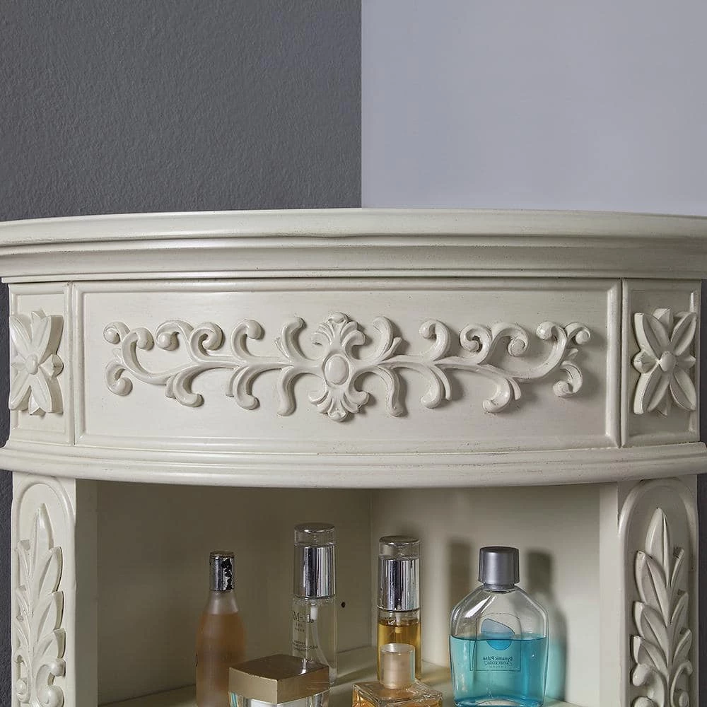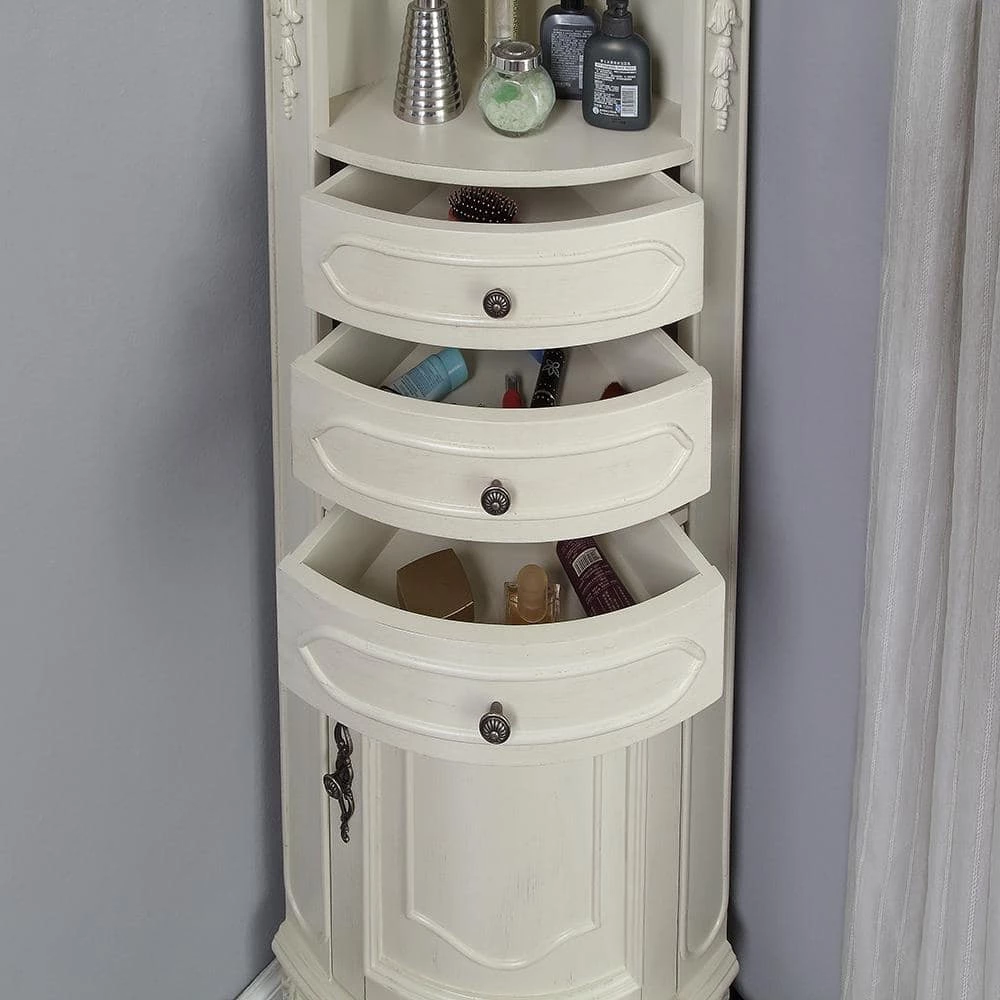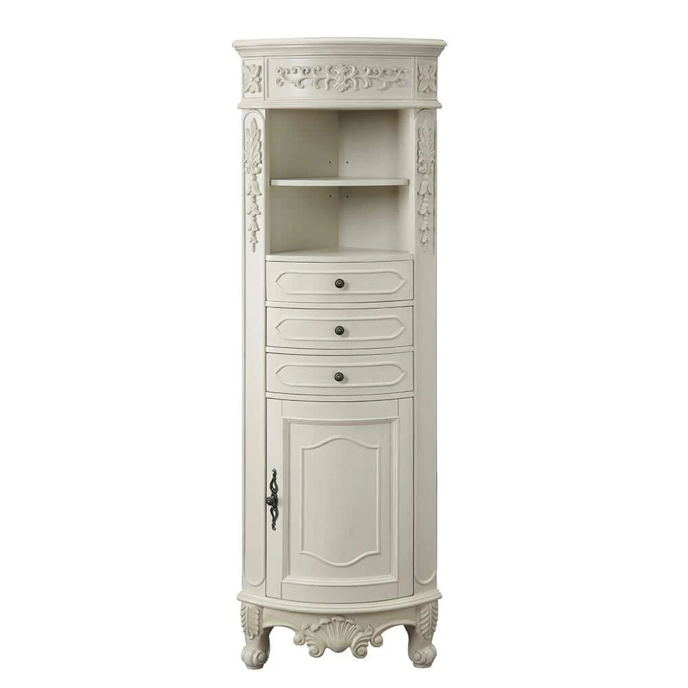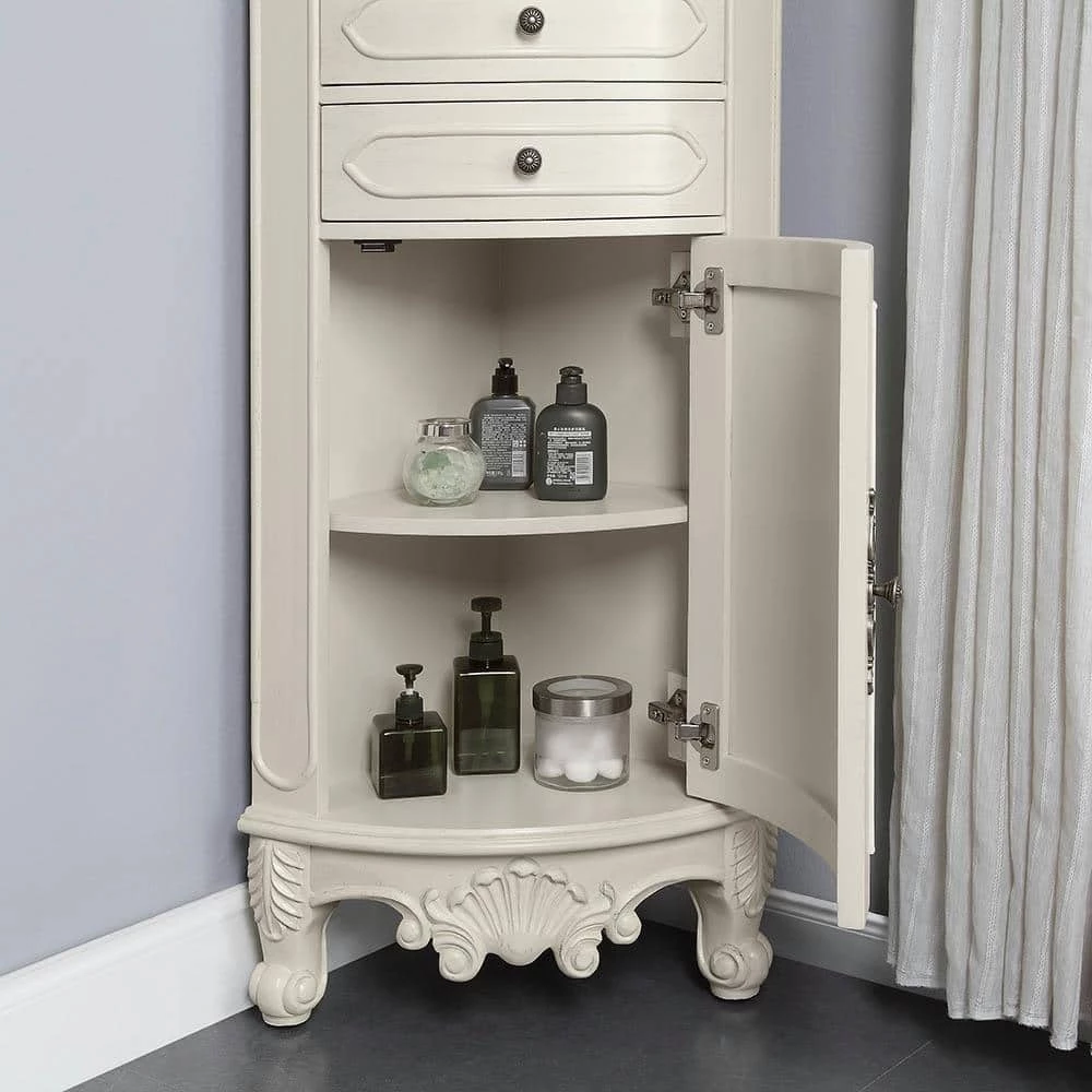 Our elegant Winslow Corner Linen Cabinet will bring traditional beauty to your bath. Nestle it into a corner to add just the additional storage you need with its open shelves, drawers and lower cabinet. This corner bath cabinet boasts elegant molding, embossed motifs, cabriole legs and ornate hardware in an antique finish.
