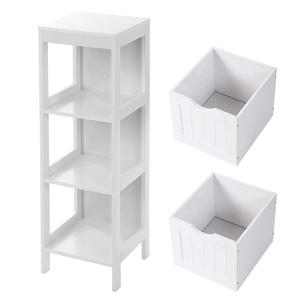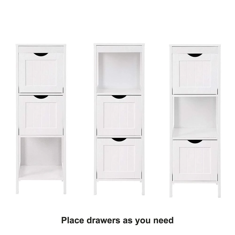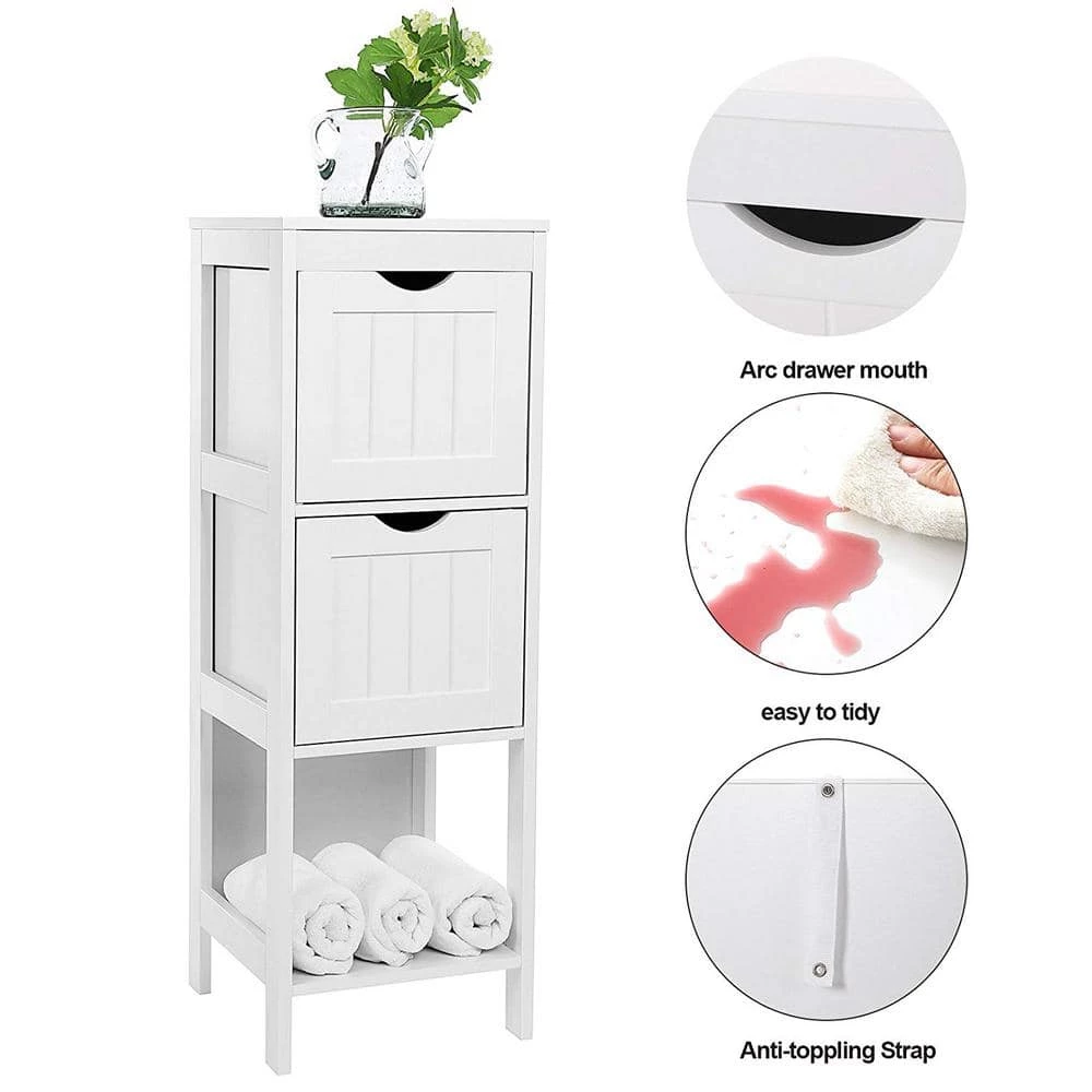 This bathroom cabinet offers classic elegance while giving more storage space in your bathroom. 1 open shelf underneath the cabinet top allows for easy access to towels or other frequently-used items. 2 roomy drawers are great for holding toilet rolls and other bathroom essentials. Featuring a sturdy MDF construction and crafted with care, this unit will last for years. With a clean white finish, the bathroom floor cabinet can easily coordinate with modern or traditional decor styles.