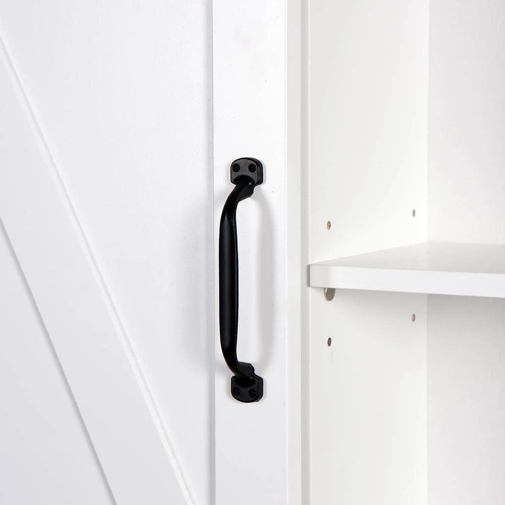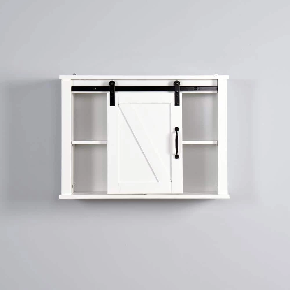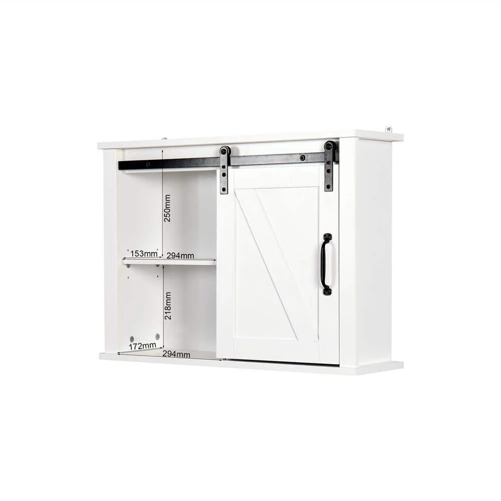 The wooden storage bathroom wall cabinet with 2 adjustable shelves has a vintage farmhouse charm. The wall storage cabinet provides function and style with decorative charm. The rustic wooden white-washed finish and sliding barn door adds a classic addition to your home decor.