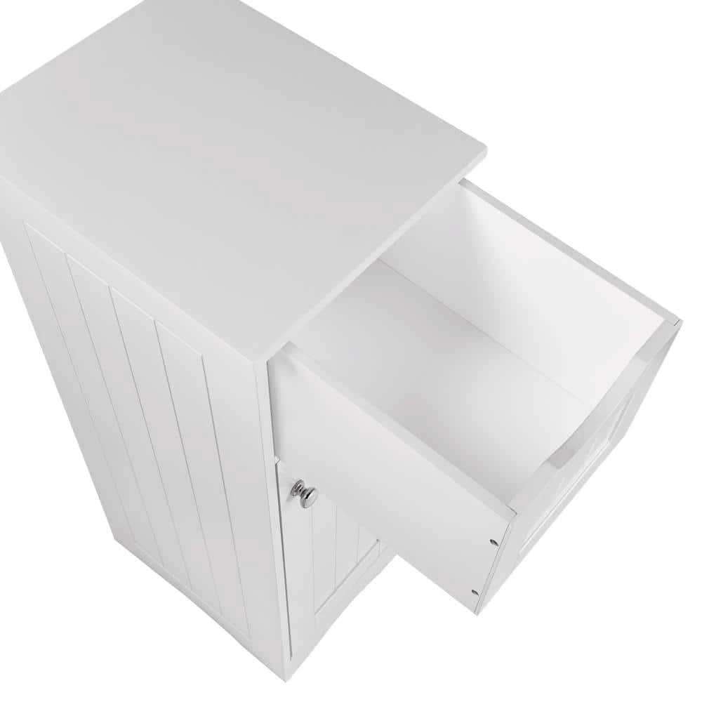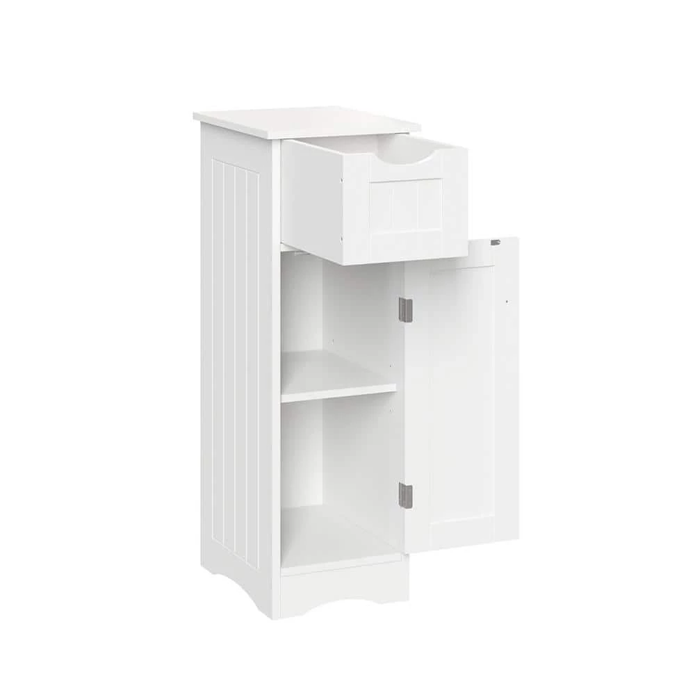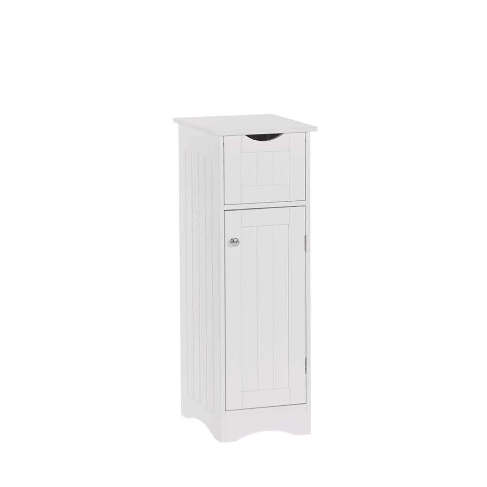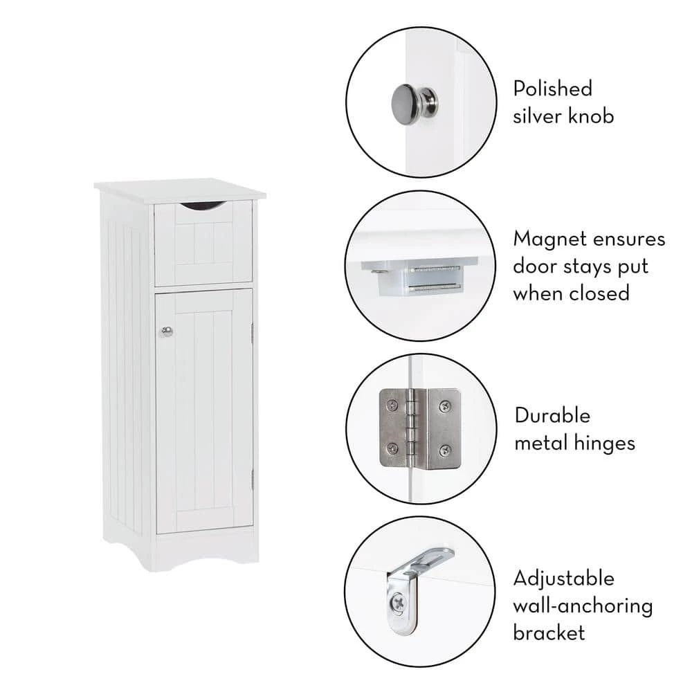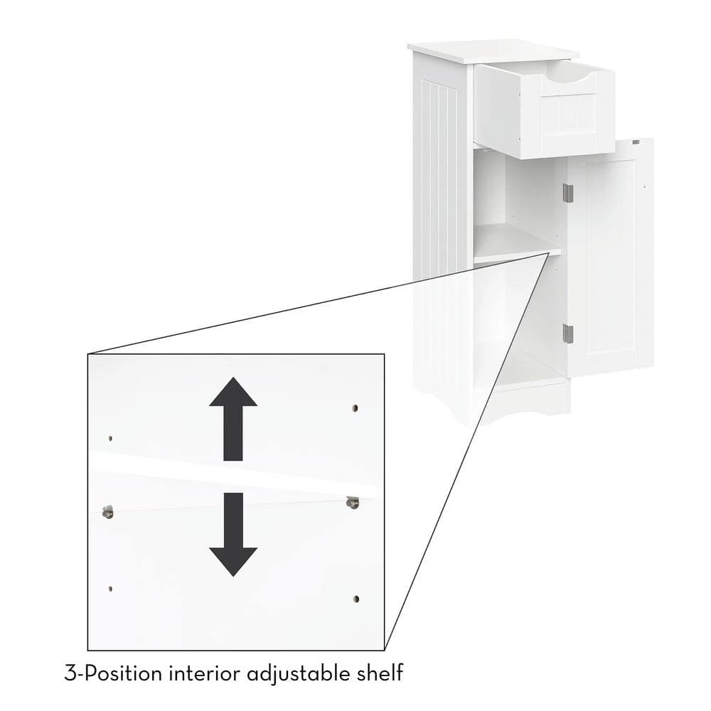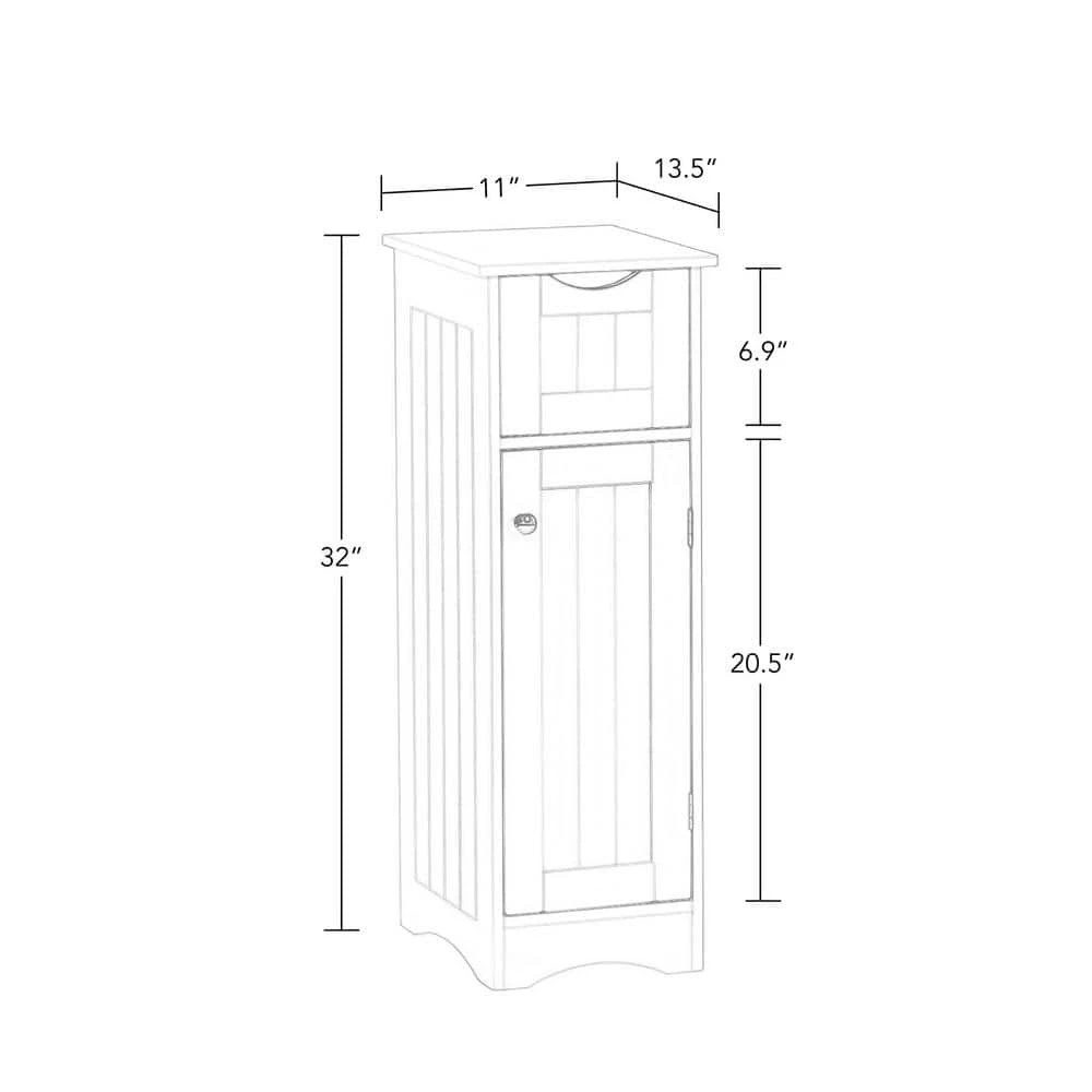 Add style and storage to small spaces with this slim floor cabinet, featuring one door and one drawer with inset beadboard styling. Cabinet door with mirrored doorknob conceals one adjustable and one fixed bottom shelf for stowing away extra toilet paper, wash cloths, bath soaps and more. A no-handle, sliding top drawer makes the perfect place for cosmetics, hair pins, shaving supplies or other compact bathroom items. Anchors to the wall for added stability and safety. Revamp the entire bathroom with additional RiverRidge Ashland Collection items. Additional dimensions: Overall Cabinet Interior: 12.25 in. D x 8.81 in. W x 20.69 in. H; Interior Drawer: 11 in. D x 8 in. W x 6.38 in. H; Interior Shelf #1: 12.75 in. D x 8.81 in. W x 9.75 in. H; Interior Shelf #2: 12.75 in. D x 8.81 in. W x 10.5 in. H; Adjustable Shelves Height Range: 9 in. – 12 in.