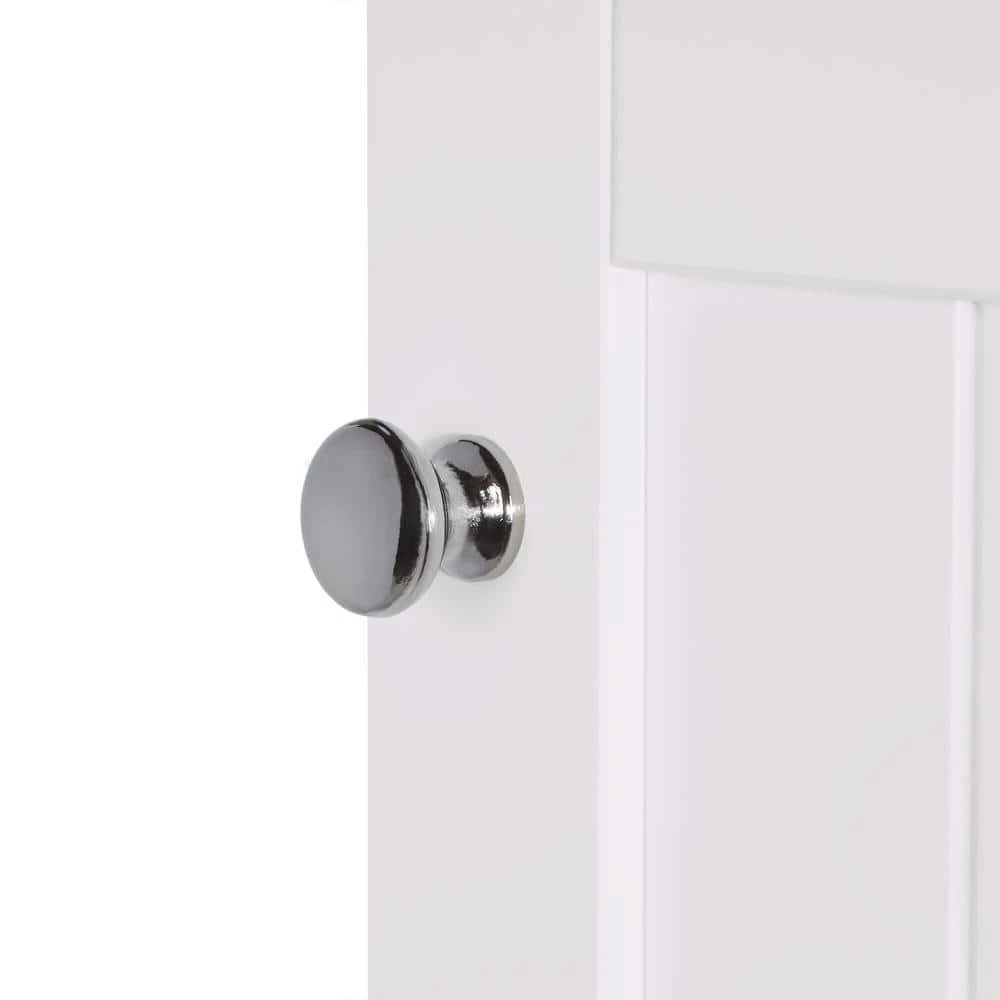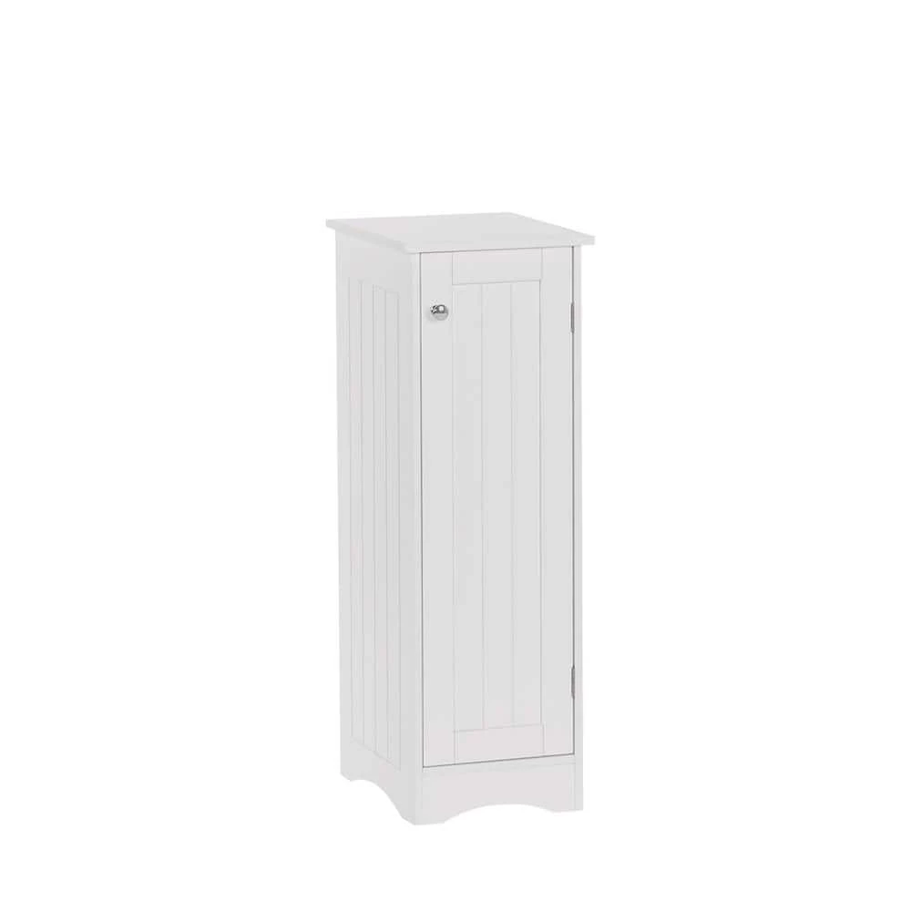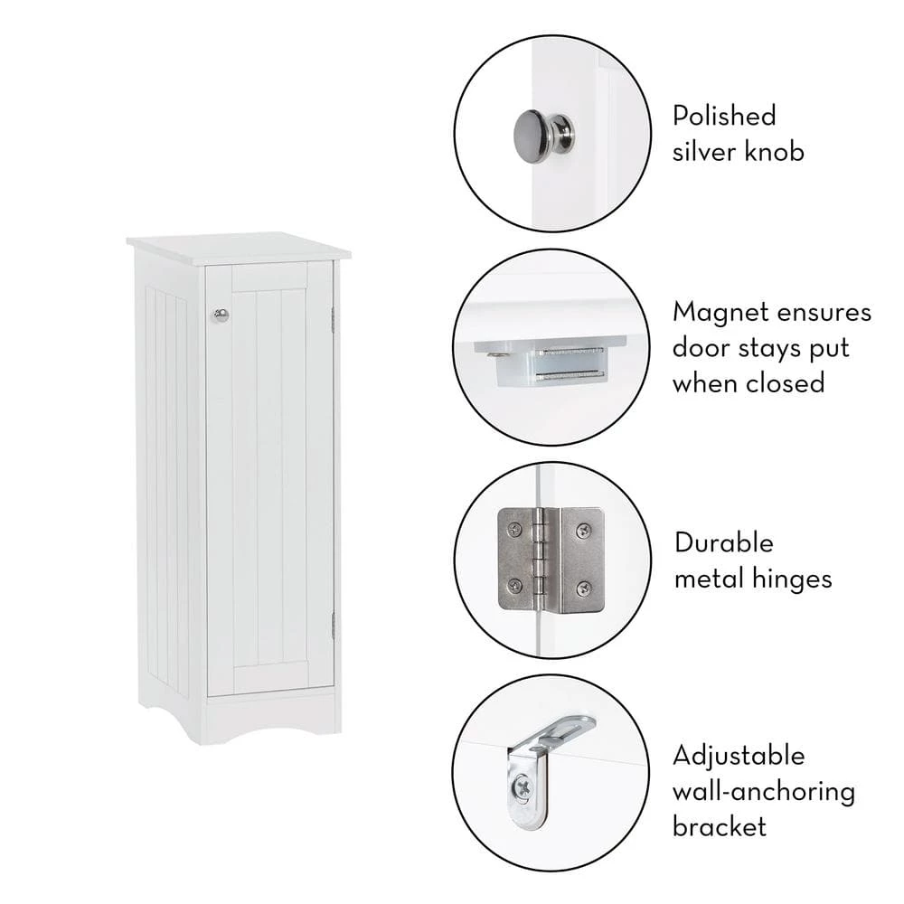 Add style and storage to narrow spaces with this slim floor cabinet, featuring a mirrored doorknob and inset beadboard styling. Slim design slides effortlessly into tight bathrooms, laundry rooms or other compact spaces, while being deep enough to hold a variety of items. Interior features two adjustable and one fixed bottom shelf for concealing toiletries, towels, candles, soaps and other bathroom necessities. Anchors to wall for added stability and safety. Revamp the entire bathroom with additional RiverRidge Ashland Collection items. Additional dimensions: Overall Cabinet Interior: 12.19-in. D x 8.81-in. W x 28.25-in. H; Interior Shelf #1: 12.19-in. D x 8.81-in. W x 8.75-in. H; Interior Shelf #2: 12.19-in. D x 8.81-in. W x 9.75-in. H; Interior Shelf#3: 12.19-in. D x 8.81-in. W x 9-in. H; Adjustable Shelves Height Range: 7.75-in. – 10.25-in.