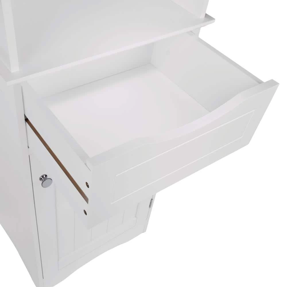 - Lower half includes one easy-slide, no handle drawer and one interior adjustable shelf hidden behind an inset beadboard style door for a clean and classic look