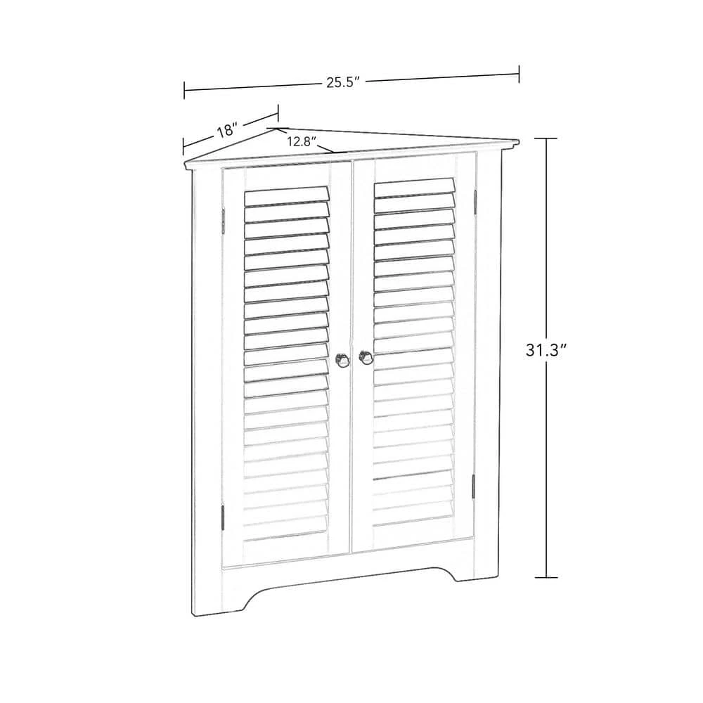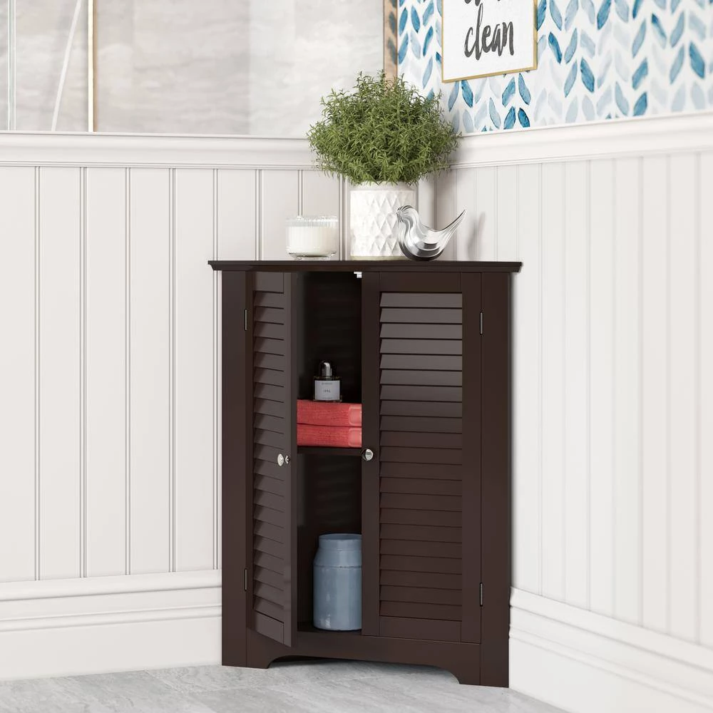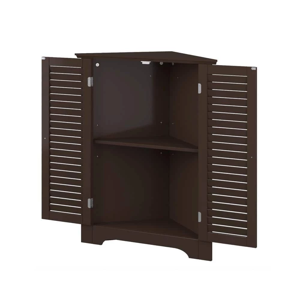 RiverRidge Home Ellsworth 3-Shelf Corner Cabinet in an espresso finish is perfect for additional storage in the bathroom or other small areas of the home as it utilizes the corner space. The traditional shutter door design adds instant appeal to any decor. Pair this piece with other pieces from the Ellsworth Collection for a matching ensemble.