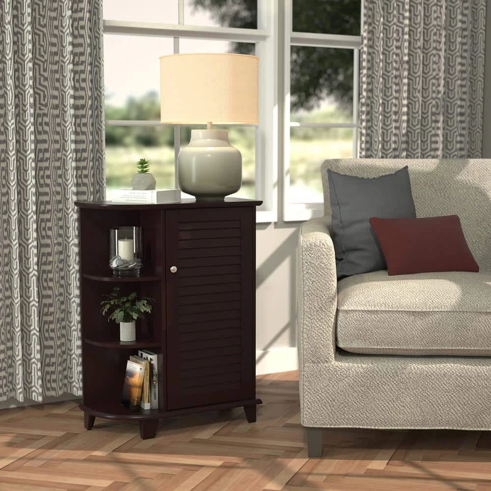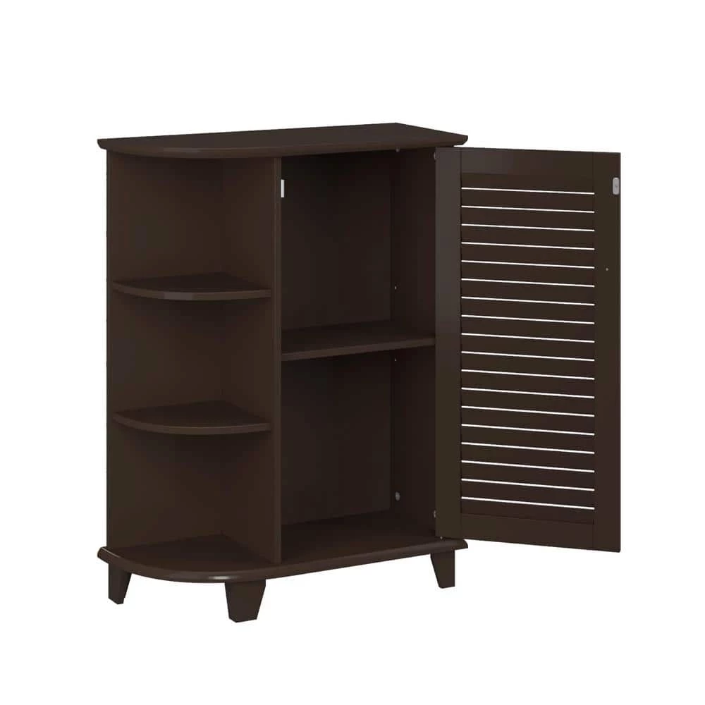 RiverRidge Home Cabinet with Side Shelves from the Ellsworth Collection features an espresso finish and a convenient single shutter door design with side shelves and a storage shelf enclosed within the cabinet. Convenient and stylish extra bathroom storage. Modern, clean design adds instant appeal to any decor. Sturdy, engineered wood construction offers beautiful finish. Pair with other pieces from the River Ridge Home Ellsworth Collection to complete your ensemble. Simple to assemble and mount.