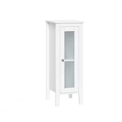 For tight spaces needing stylish storage, this slim, single door floor cabinet makes the perfect addition to bathrooms, laundry rooms and any other room in the home. Open the reeded glass door and place extra hand towels, cleaning supplies and more on the adjustable interior shelf, then allow the door to close quietly with its soft-close hinges. The top open shelf is perfect for displaying your favorite home decor items or placing your most-used items for easy access. With its smooth, white painted finish and polished silver doorknob, this cabinet boasts timeless, classic style that adds a bit of extra storage space to rooms with any decor theme. Includes instructions for easy assembly and secures to the wall with an adjustable anchor bracket for added stability. Give your space an organizational makeover with the entire RiverRidge Home Prescott Collection.