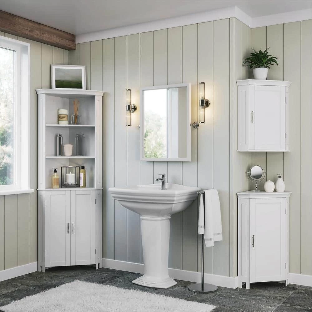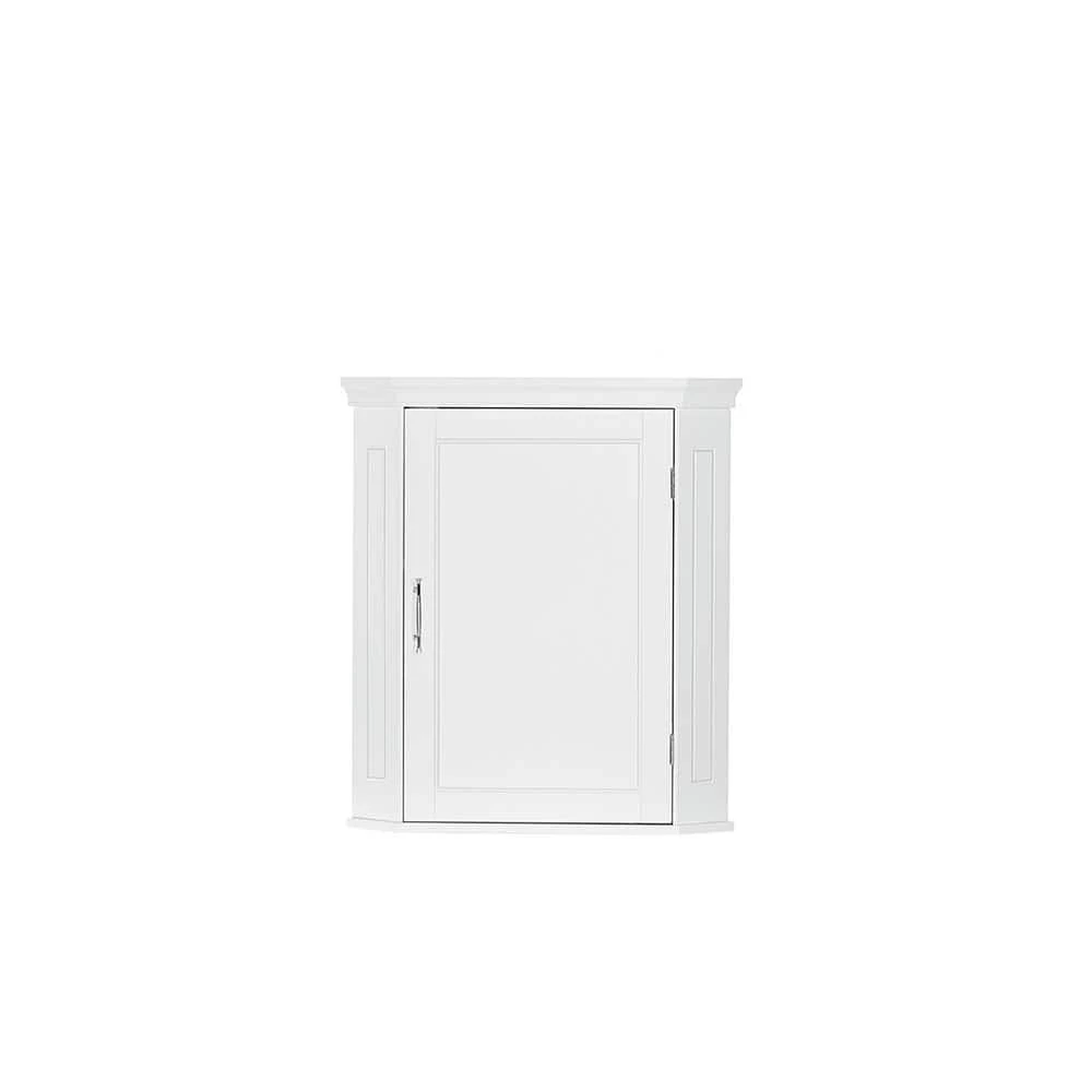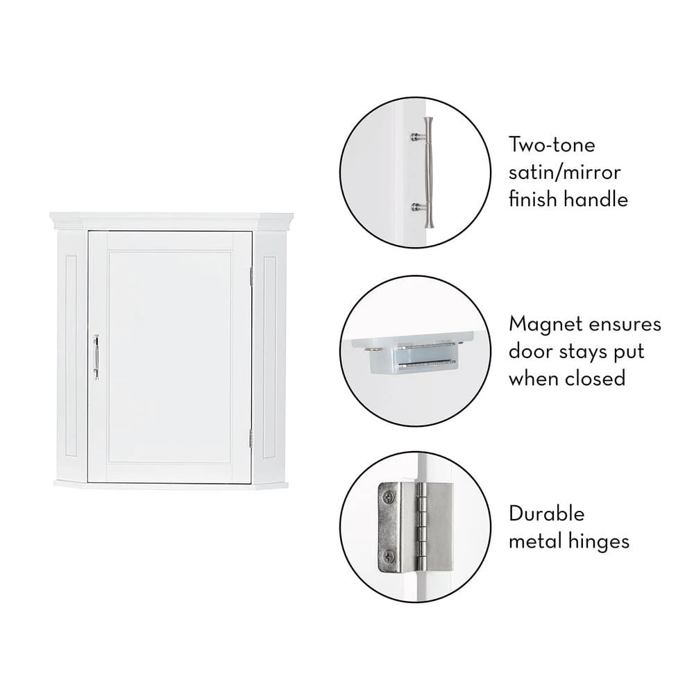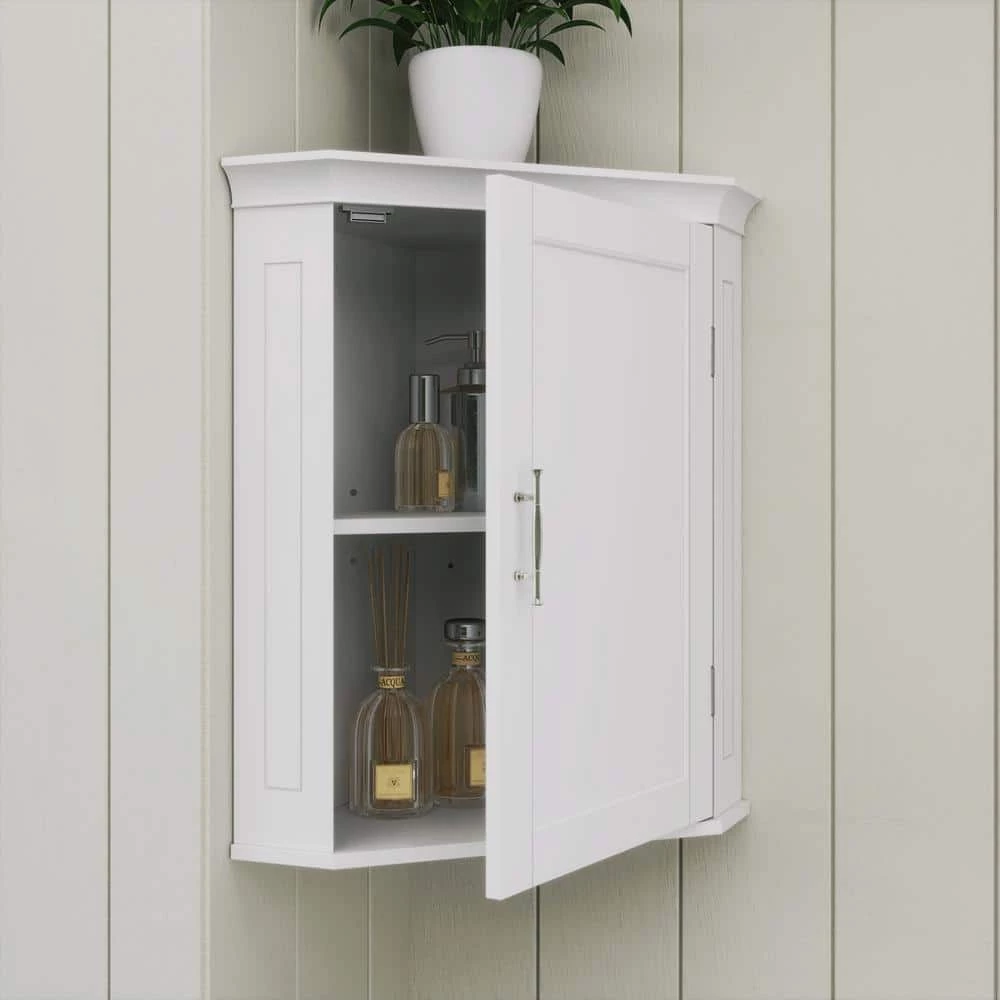 Maximize storage capacity in the bathroom or laundry room with the RiverRidge Somerset Corner Wall Cabinet that features a classic design and attractive detailing such as inset doors and side panels, coved top shelf and two-tone satin/mirror finish handles. Additional dimensions: overall cabinet interior: 18.5 in. W x 11.5 in. D x 21.75 in. H, interior shelves: 18.5 in. W x 11.5 in. D, space between interior shelves: adjustable (8 in. – 13.25 in.).