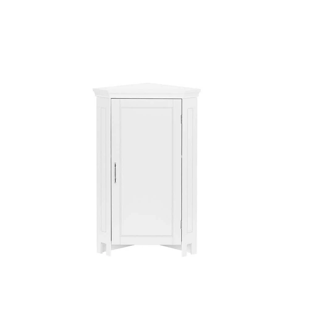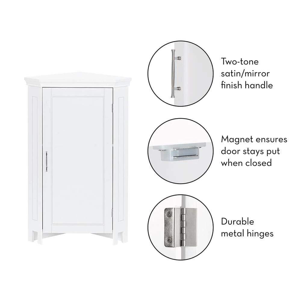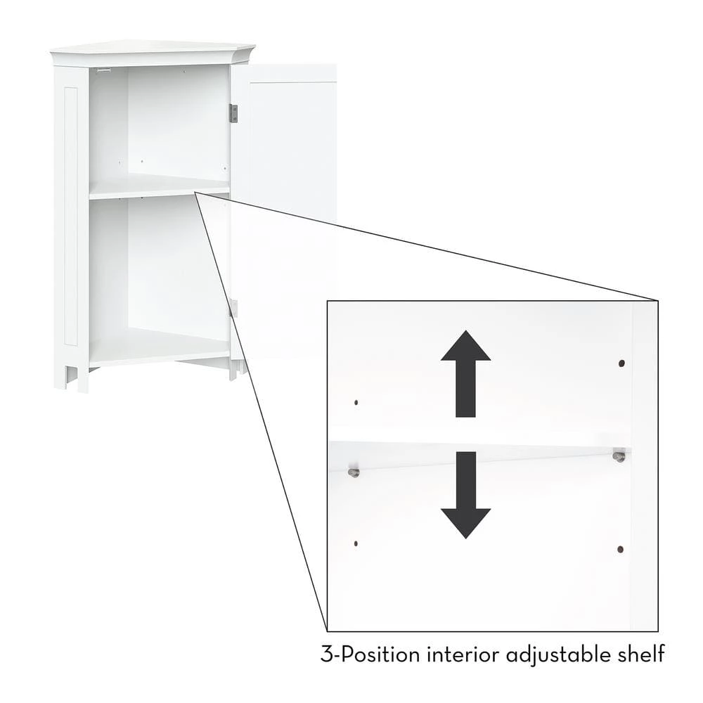 Maximize storage capacity in the bathroom or laundry room with the RiverRidge Somerset Single Door Corner Cabinet that features a classic design and attractive detailing such as inset doors and side panels, coved top shelf and two-tone satin/mirror finish handles. Additional dimensions: top shelf: 14.5 in. L x 20.5 in. W x 13.38 in. D, overall cabinet interior: 17.75 in. W x 11 in. D x 27.5 in. H, interior shelves: 17.75 in. W x 11 in. D, space between interior shelves: adjustable (10.88 in. – 16.13 in.).