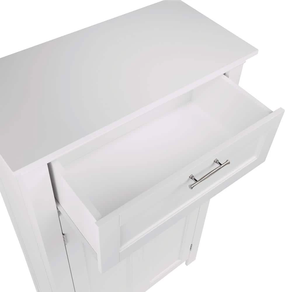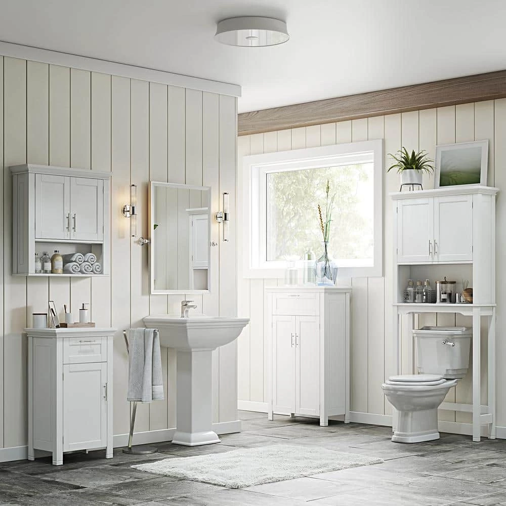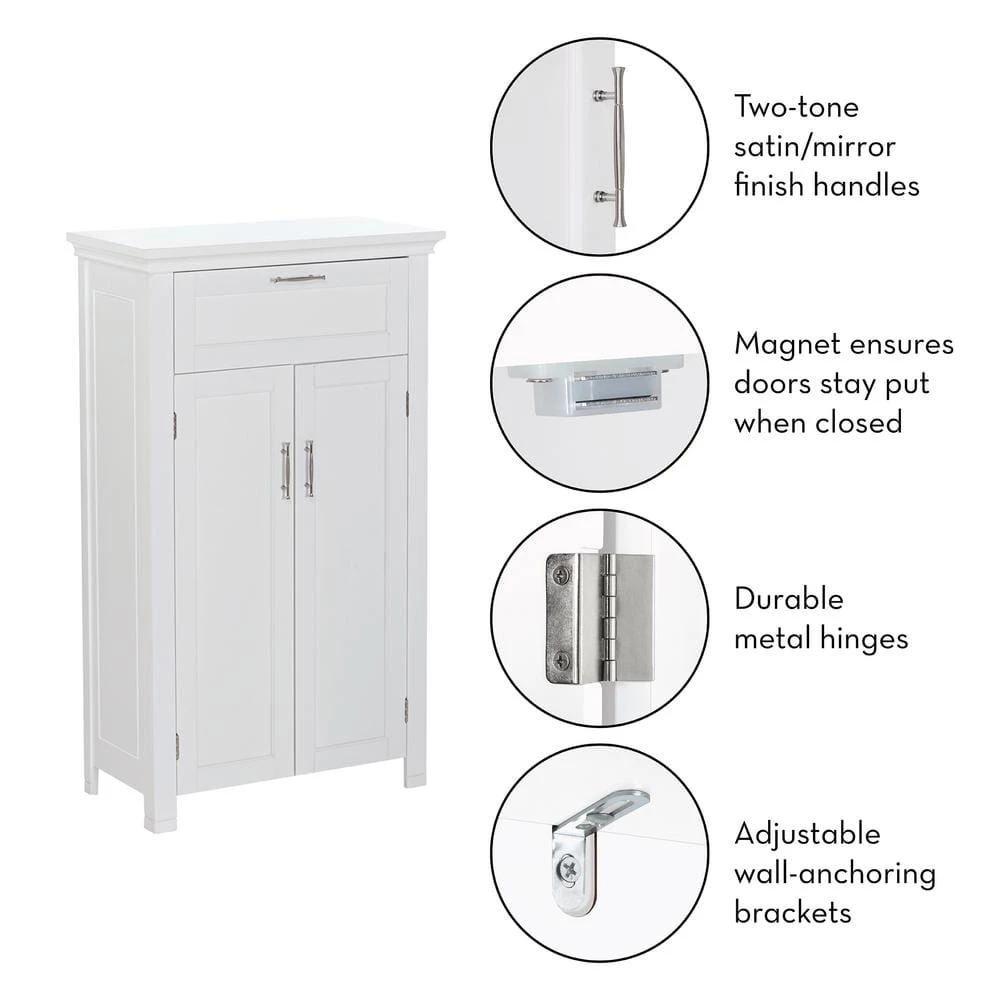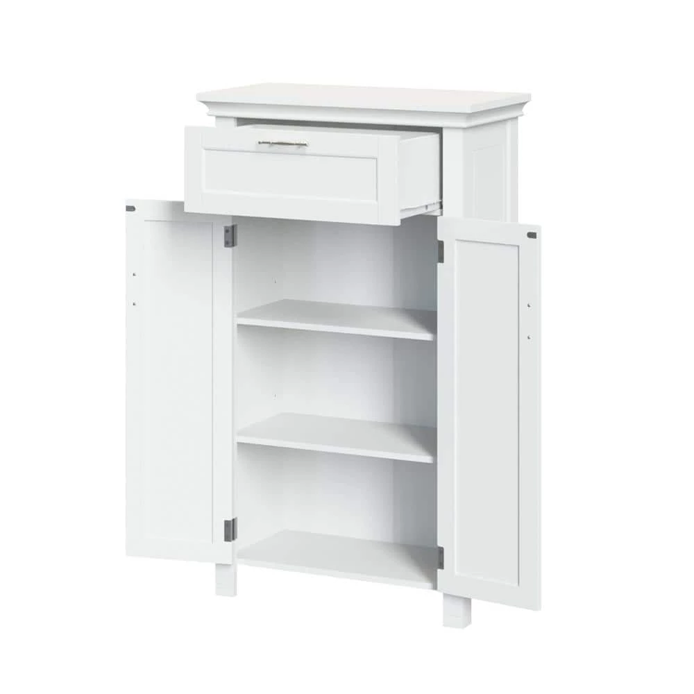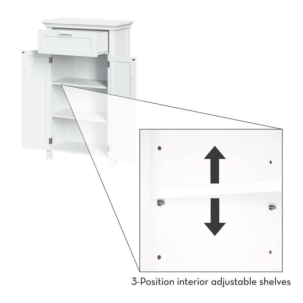 A classic Somerset Floor Cabinet in white from RiverRidge Home features a detailed inset door, drawer and side panels. Coved design top and two tone satin/mirror finish handles. Easy open drawer and behind closed doors the inner shelves are adjustable. Easy to assemble. Look for other great Somerset bath items from RiverRidge Home to complete your ensemble.