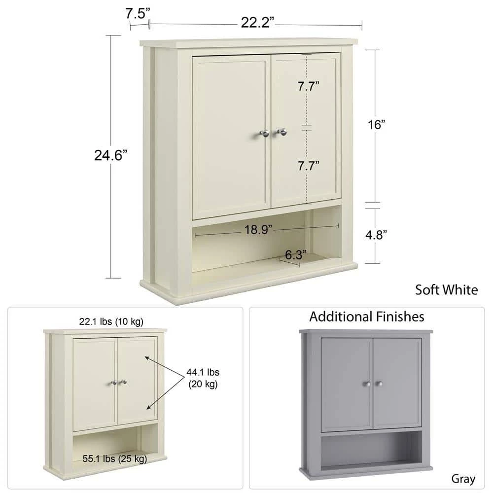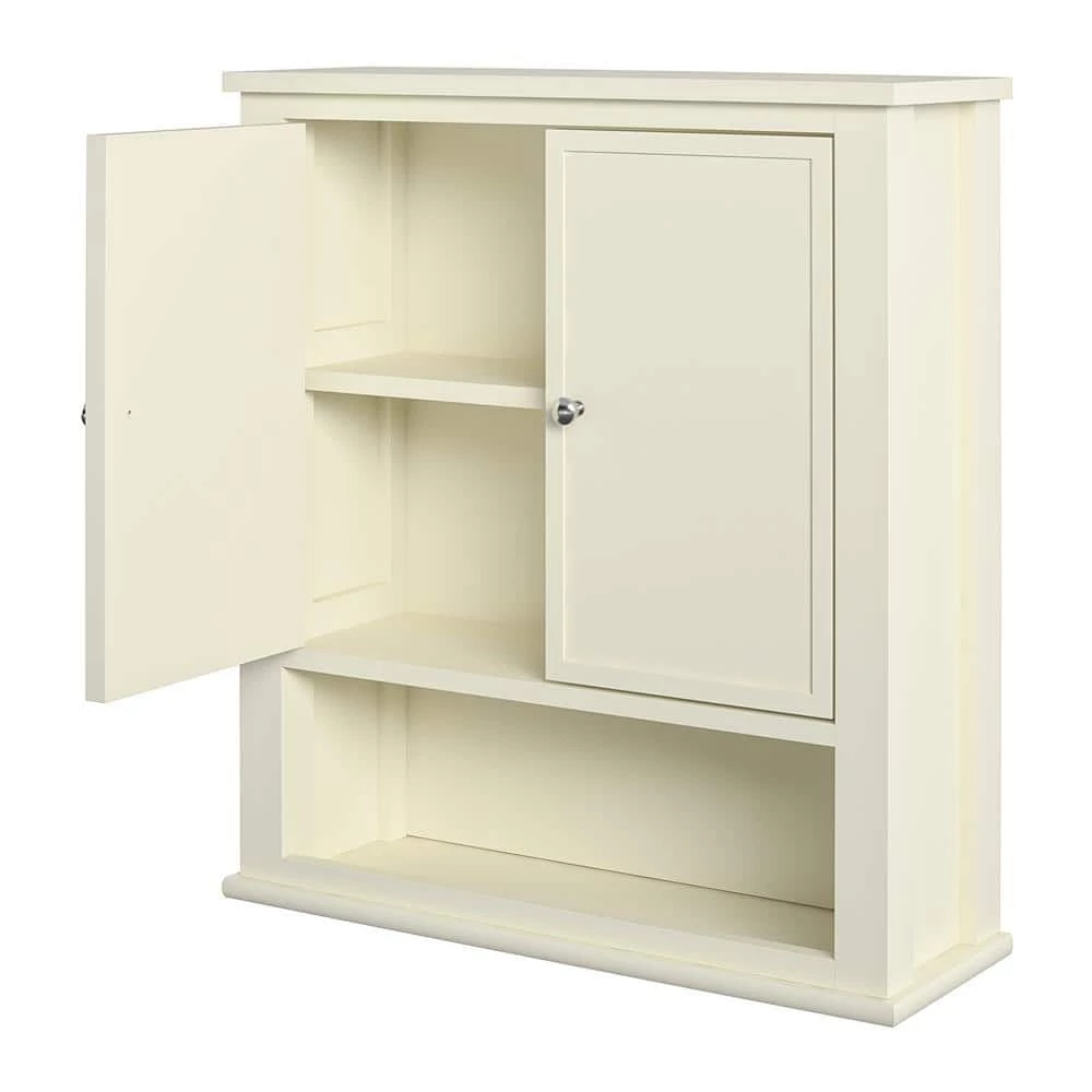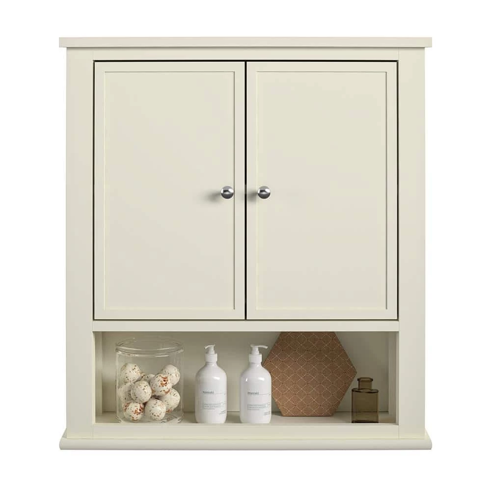 If your bathroom is short on space and storage, the SystemBuild Queensbury Wall Cabinet is the answer you’ve been looking for. Made of painted MDF, the neutral off-white finish pairs with the brushed nickel door knobs and decorative molding for an instant upgrade for your space. Have easy access to essentials by storing them in the lower open cubby. The 2 doors conceal 2 shelves so you have plenty of space to store away extra toilet paper, tissues, and makeup. The EZ Hang System gives you a sturdy and level hang on the first try. Simply level and attach the support beam to studs and then hang the Cabinet for a quick and easy installation. The Wall Cabinet ships flat to your door and 2 adults are recommended to assemble. Once assembled, the Cabinet measures to be 24.57 in. H x 22.2 in. W x 7.48 in. D.