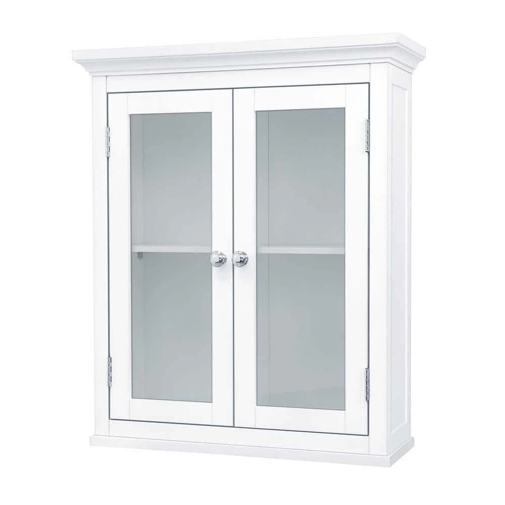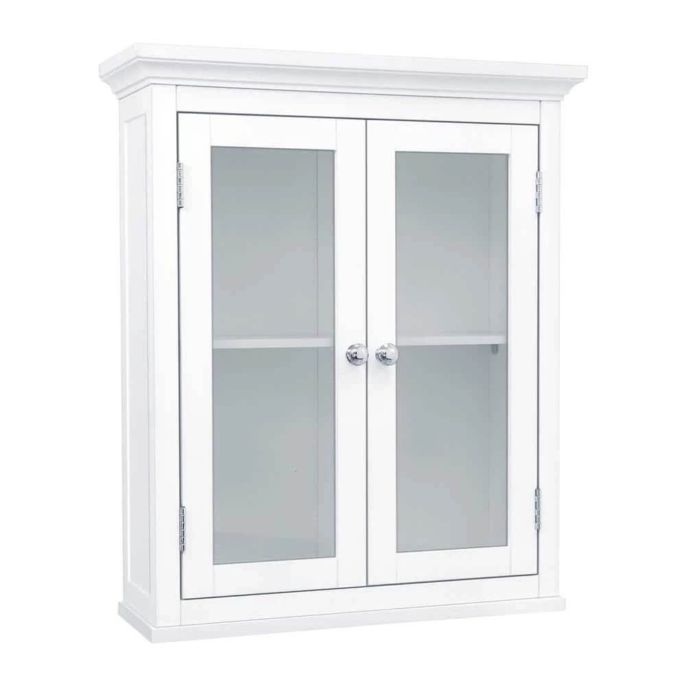 The Wilshire Wall Cabinet in White from Elegant Home Fashions provides a stylish solution to your bathroom storage needs. The unit features chic crown top moulding and an adjustable shelf that fits your exact needs. Two beautiful glass-paneled doors provide a clear view into the cabinet and feature metal knobs for easy access. Complete with a versatile white finish, the cabinet is constructed with sturdy MDF engineered wood and comes with all hardware needed for assembly.