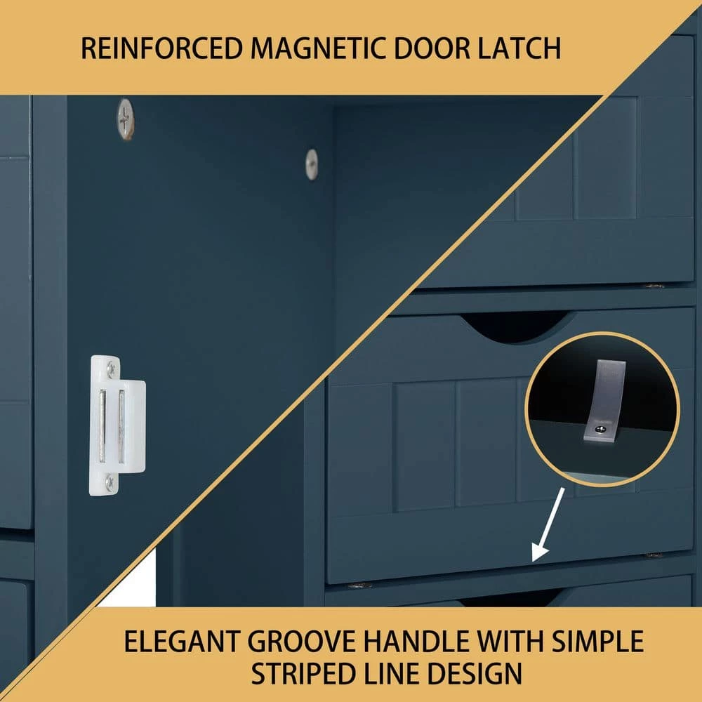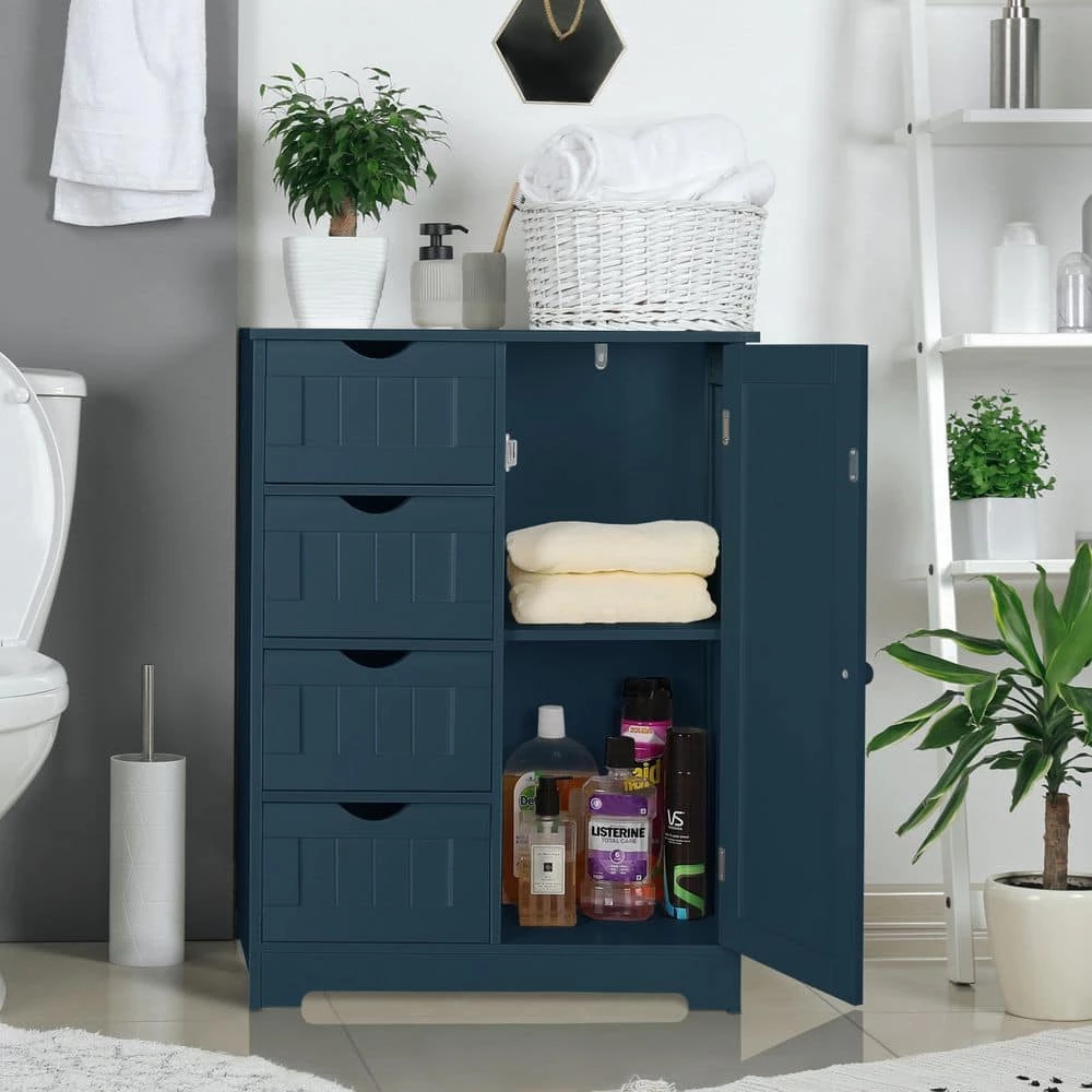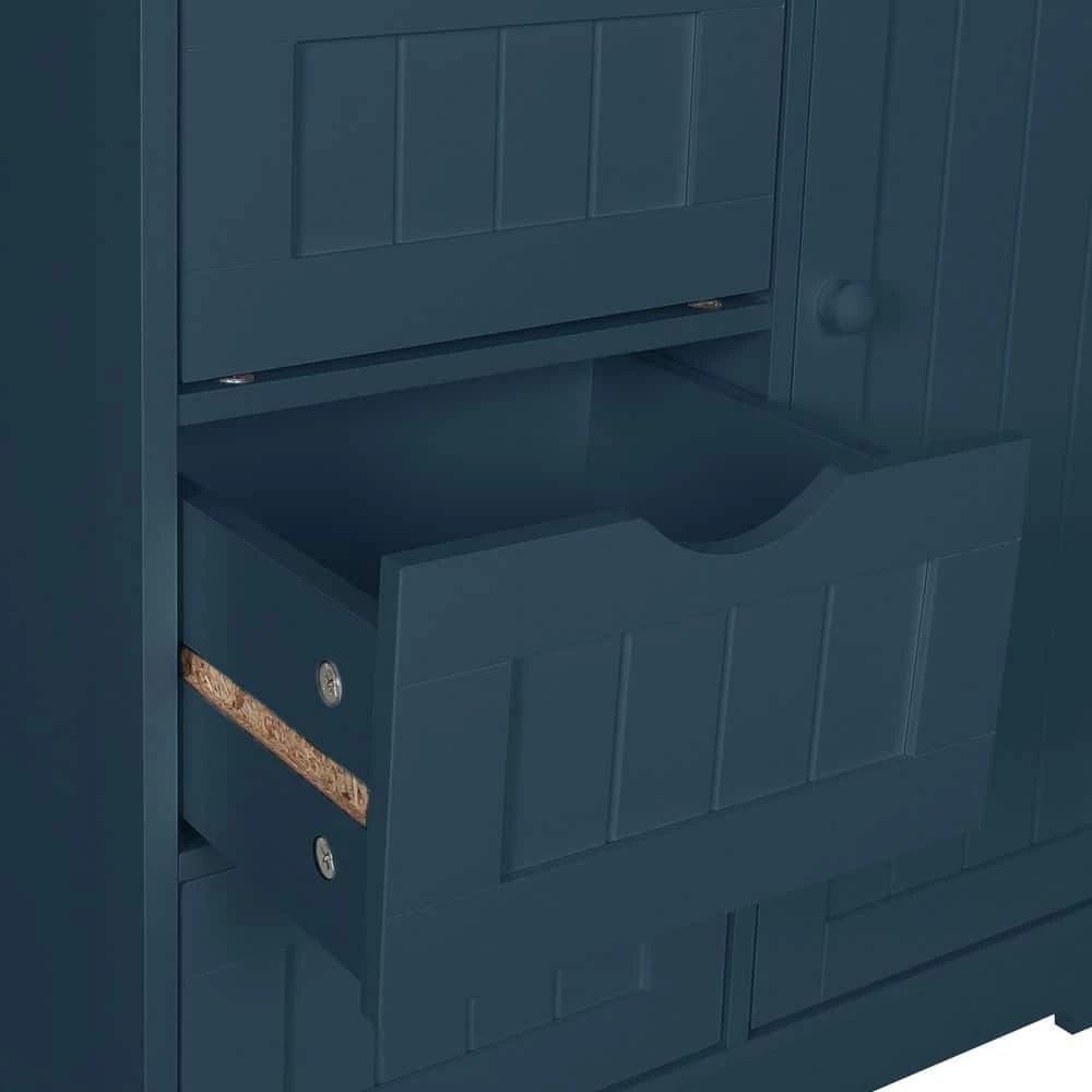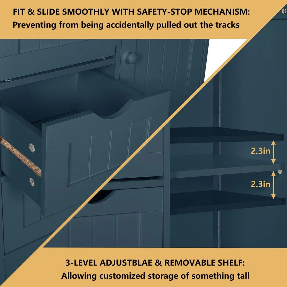 Blue furniture is particularly popular in bathrooms as it gives the room a peaceful touch. Most important is that the bathroom furniture should offer plenty of storage space. Our cabinet features all requirements for bathroom storage. This storage unit features 4 drawers and a half cabinet with an adjustable shelf, which can nearly store all bathroom necessities. And the arched drawer opening prevents injuries when opening and closing. In addition, the water-resistant white paint finish is easy to clean. If not used in your bathroom, can work great in your bedroom or living room as a gray accent piece.