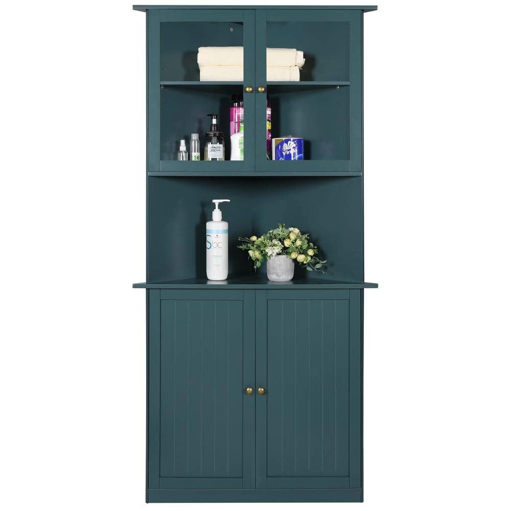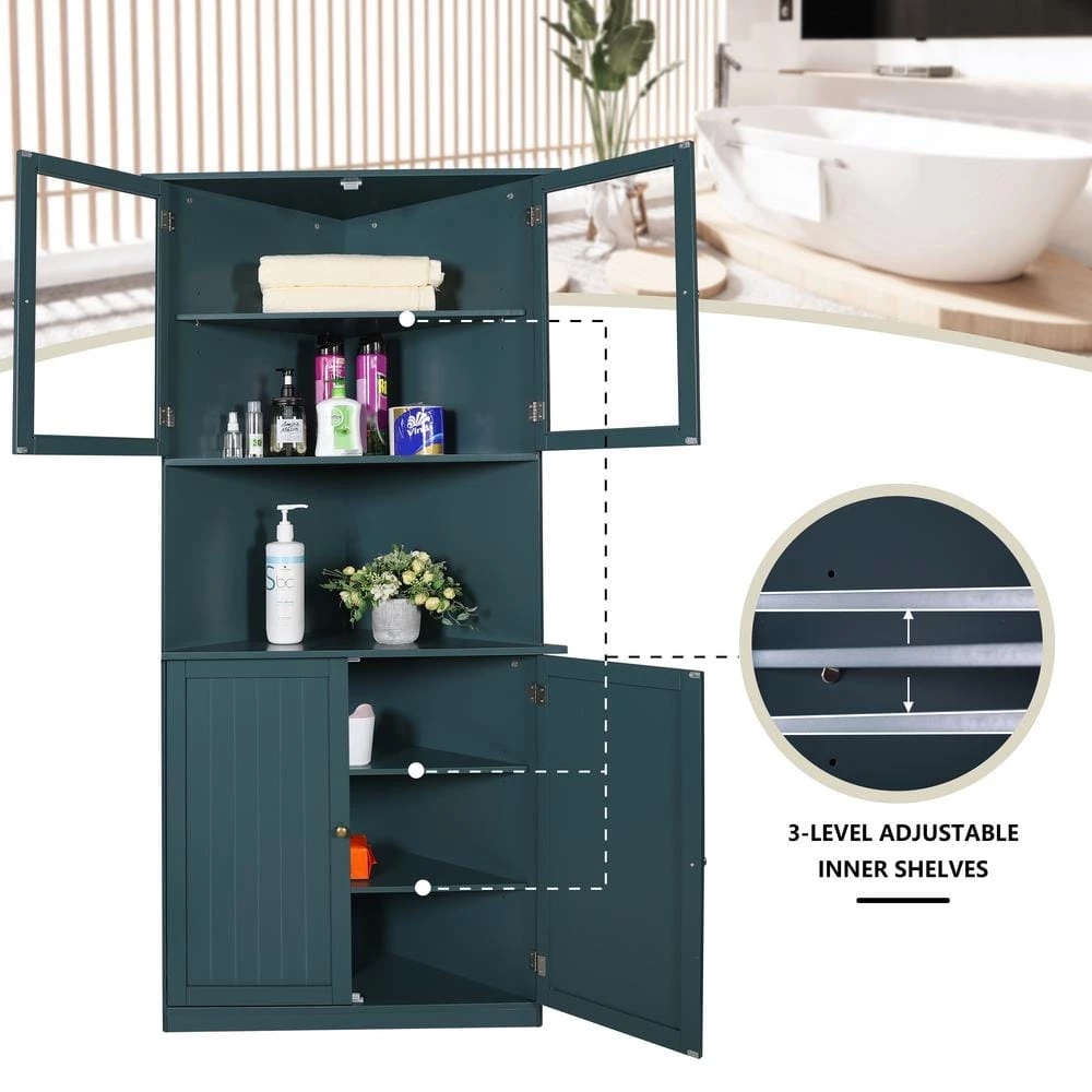 The corner cabinet is made of MDF material, the overall dimensions of this corner cabinet storage is 34.3 in. L x 24.6 in. W x 71 in. H. It is designed as a triangle shape, which can fill up an unused corner and turn it into valuable space. This corner shelf can work out perfectly for bathroom, kitchen, living room or bedroom. The shelves of the corner cabinet can be adjustable according to your needs to create a larger storage space for some big items. Glass doors makes your inside clean and dry. This great corner cabinet storage will be perfect addition to your home.