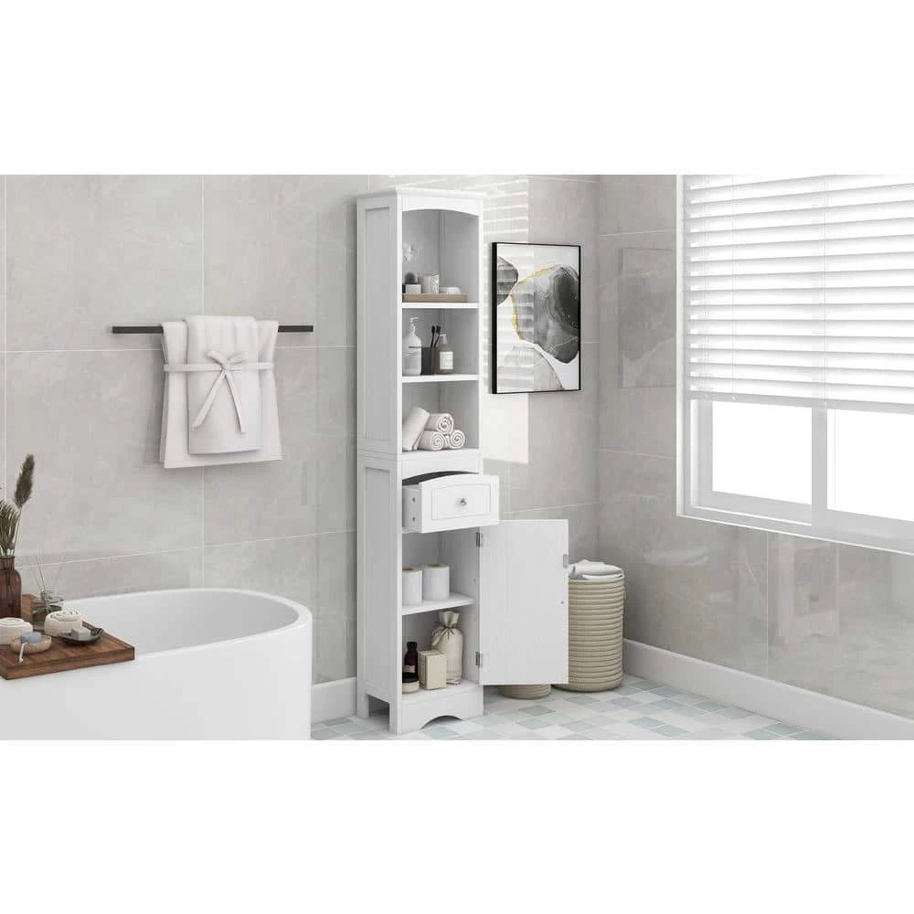 Featured with a sleek and classic look in light color. The top and bottom panel has a beautiful curve design, and the groove pattern on the drawer and door adds more elegant elements to satisfies the combination with your bathroom decoration style. All hardware and manual instruction are included in the package to help to accomplish a quick assembly.
