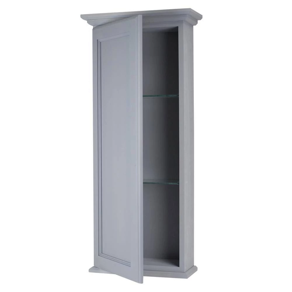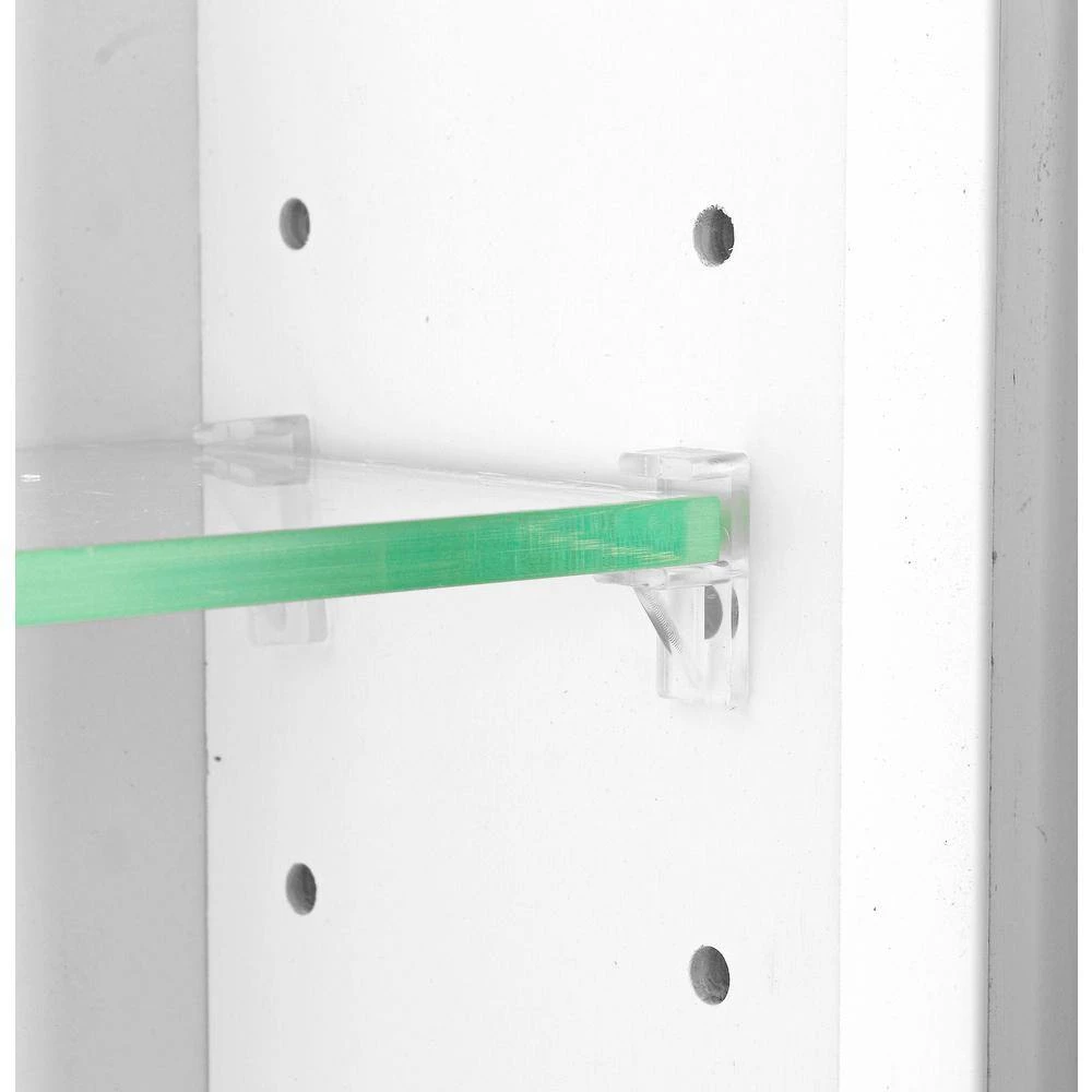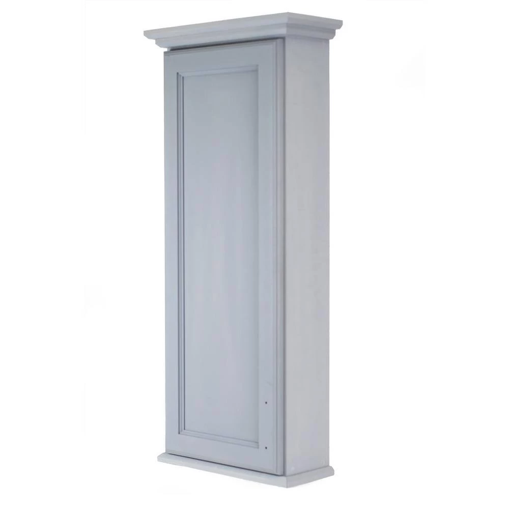 Mounts on the wall with steel mounting brackets inside for an easy installation. There is no need to worry about where the studs are in the wall with 2-mounting methods. 5-fully adjustable glass shelves slide into our patented shelf supports so they don’t tip or rock. Inset panel door sits on concealed hinges with a soft close feature, door is reversible so you can mount it to open in either direction. Perfect as a medicine cabinet, spice cabinet, or storage cabinet anywhere. Overall measurements are 43.5 in. H x 15.5 in. W x 4.25 in. D. You’ll have nearly 3.5 in. of depth inside the cabinet. Primed and ready for you to paint. Solid pine cabinet box with solid maple door. Proudly made in Sarasota, FL.